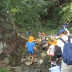 毎年恒例のサワガニ捕りをおじいちゃんおばあちゃんたちと楽しみます。万年青会の方々との交流は、5月に続いて2回目・・