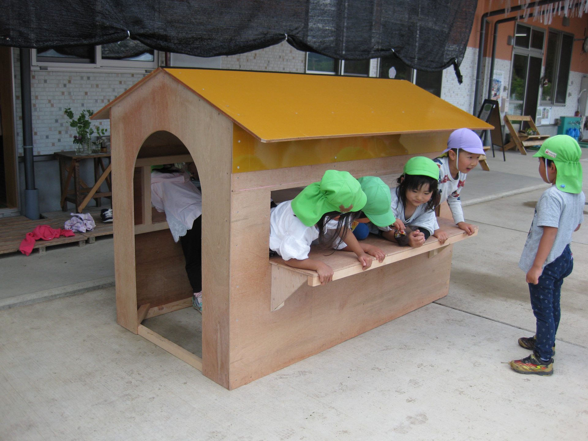 どんなおうちがいいのかな? みんなでアイディアを出し合って、 カウンター付きのおうちになりました!