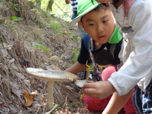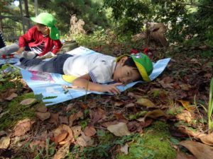 落ち葉の音を楽しみながら登りました。落ち葉の上に寝転んで落ち葉の匂いをかいだり、アリジゴクを見つけたり、キノコを見つけて大きさを比べたり、色を比べたり、形を比べたり… 秋の山は、発見がいっぱいです。