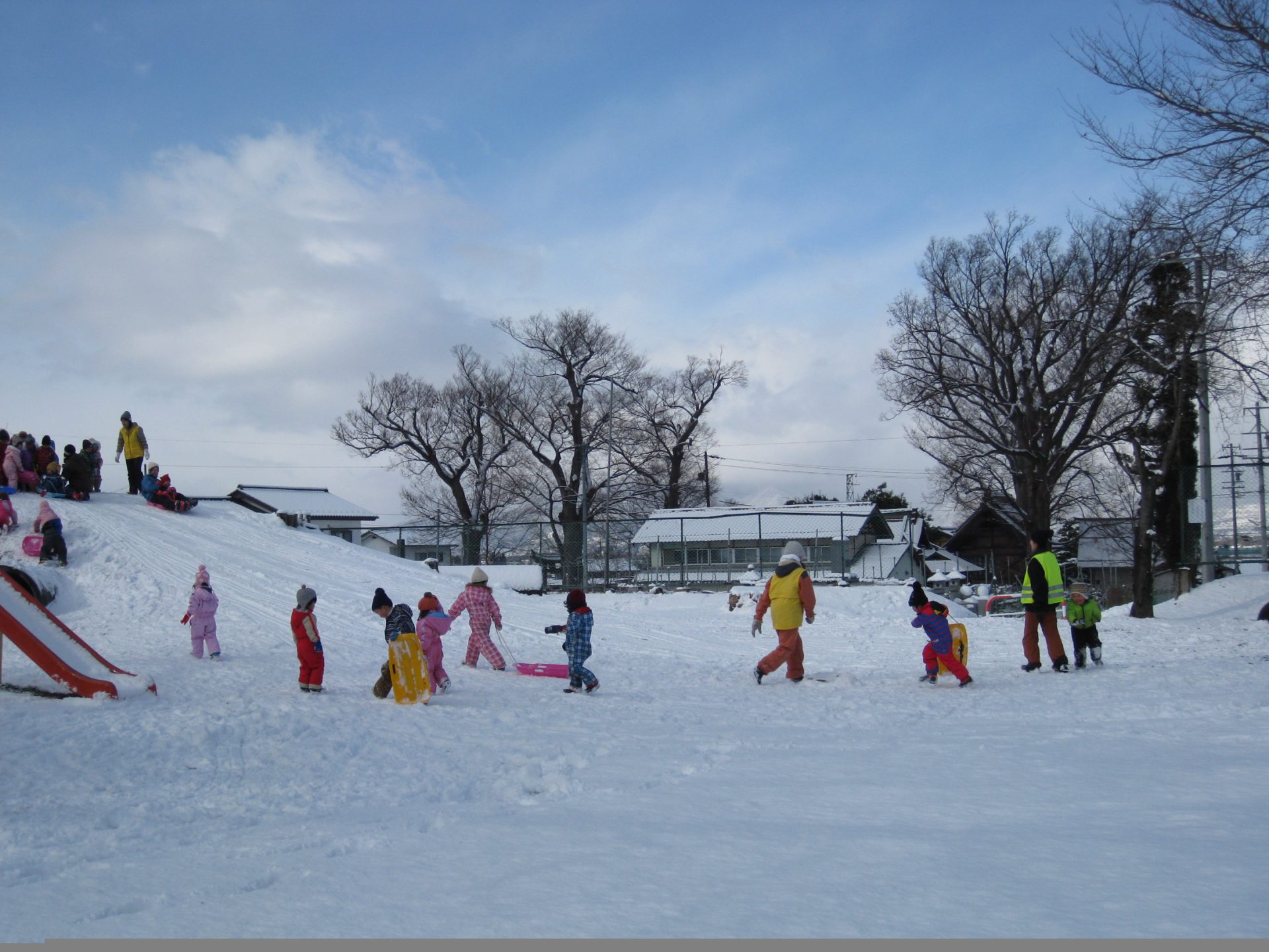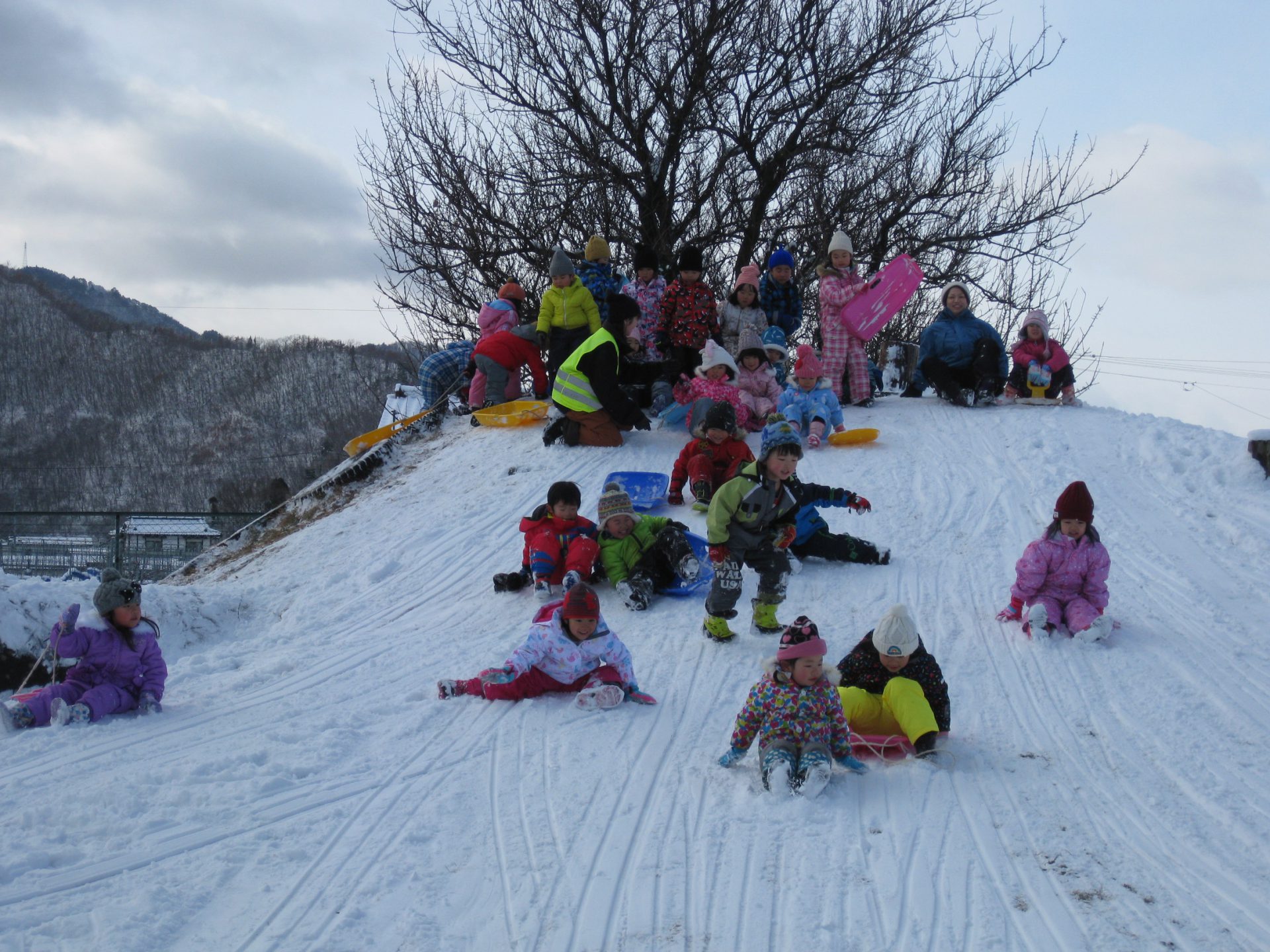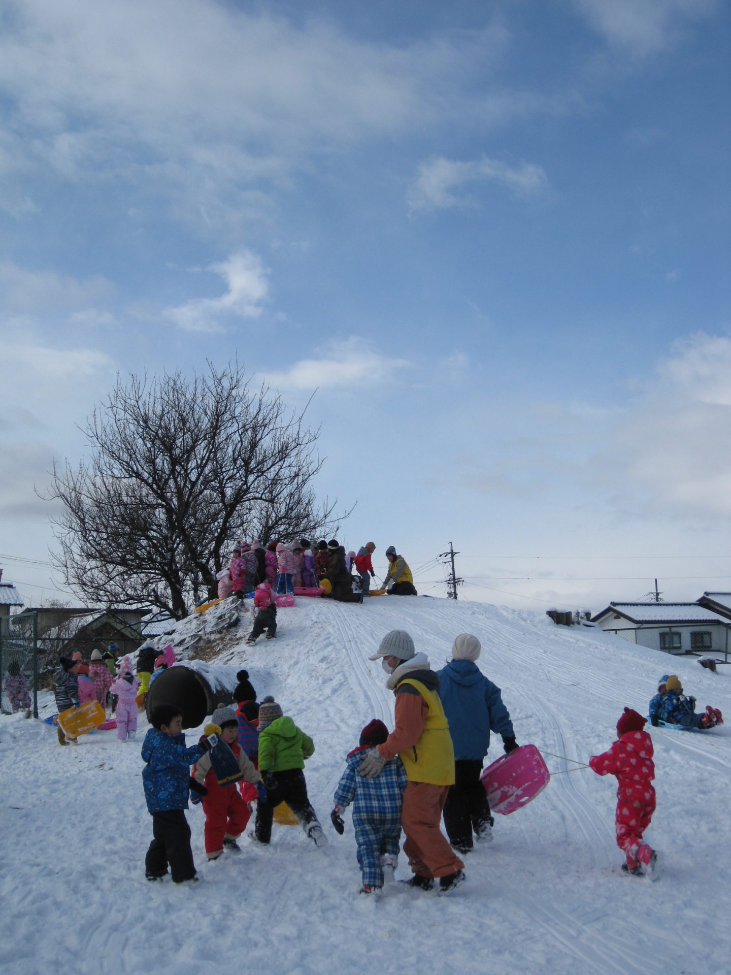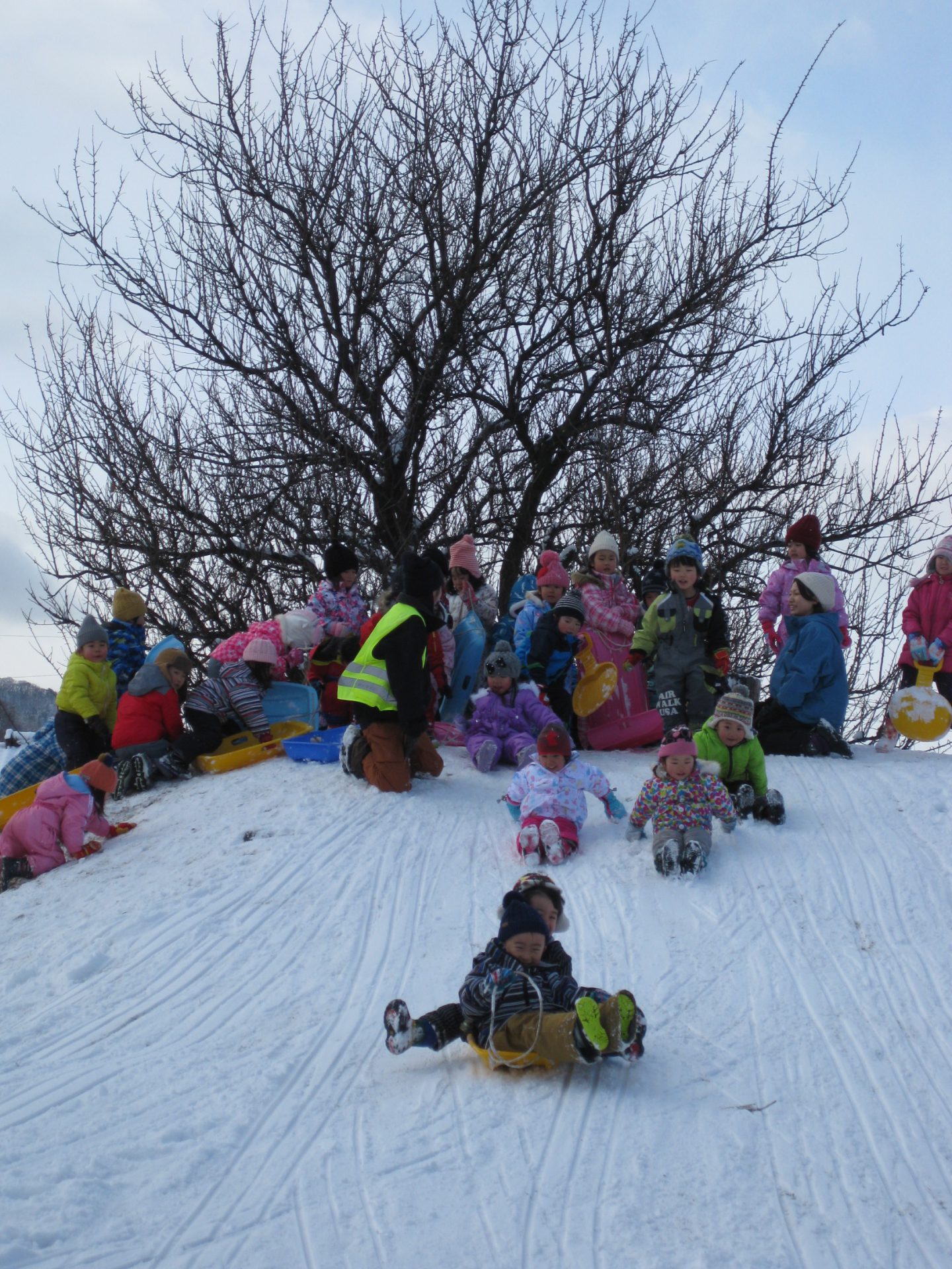 子供たちが待ちに待った雪が降りました。 今日は、お隣の小学校の築山をお借りしてソリ遊びをしました。