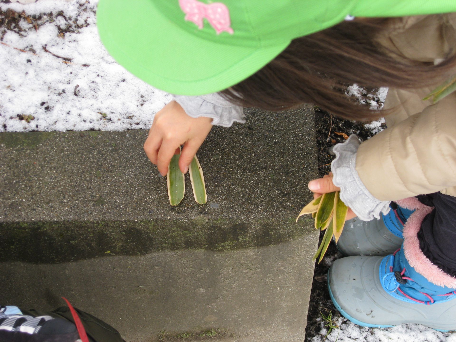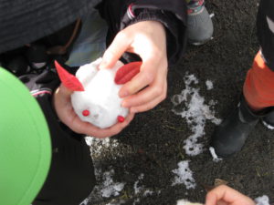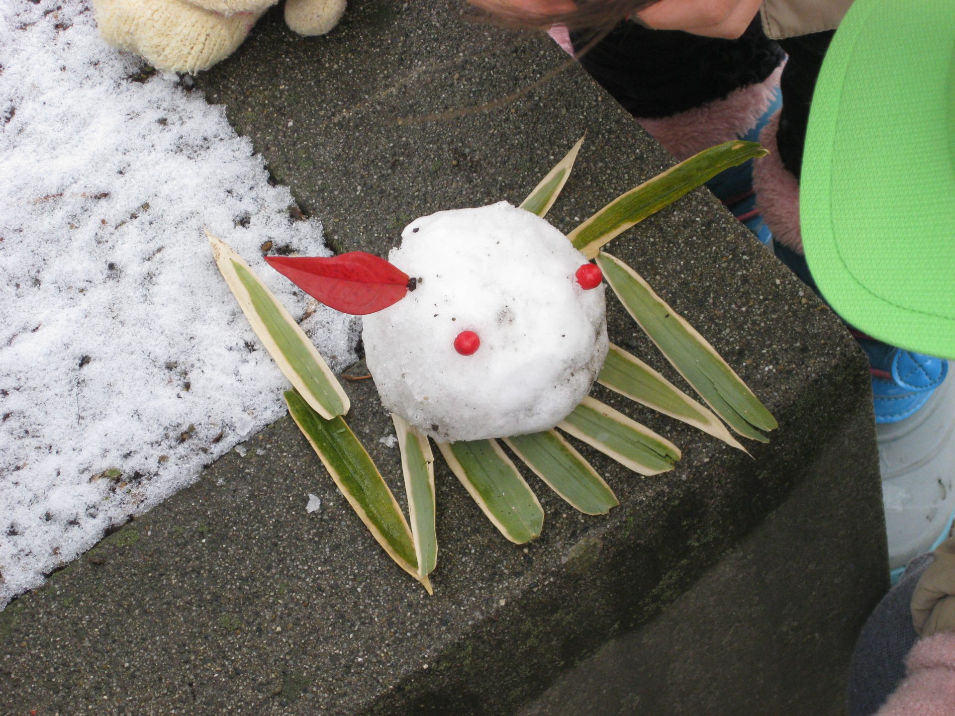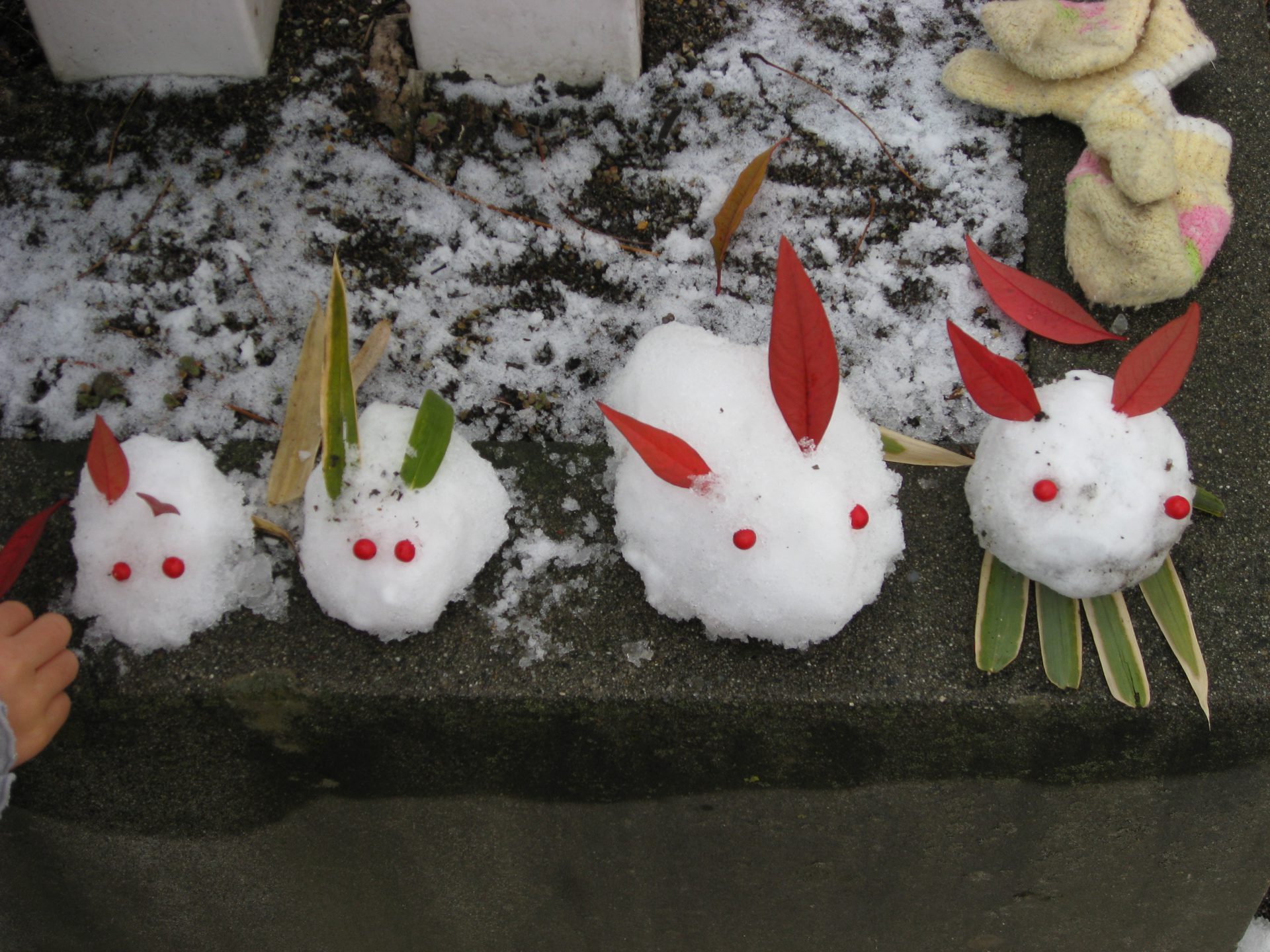 うっすら積もった雪を集めて、雪うさぎを作りました。