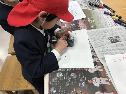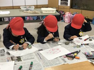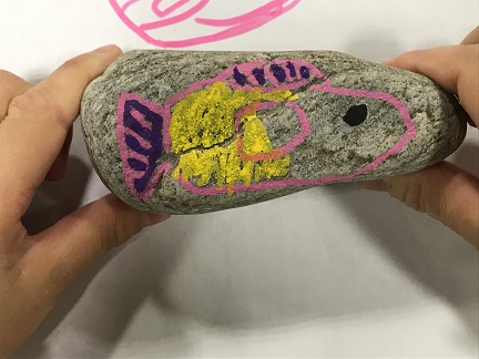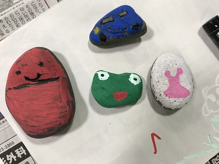 河原の石で「石ころアート」。石の形からイメージしたり、好きなものを描いたり、ちびっ子芸術家達はなかなかの作品を作ったようです。