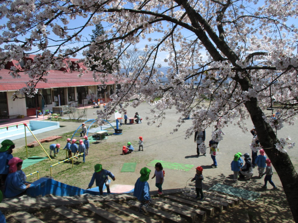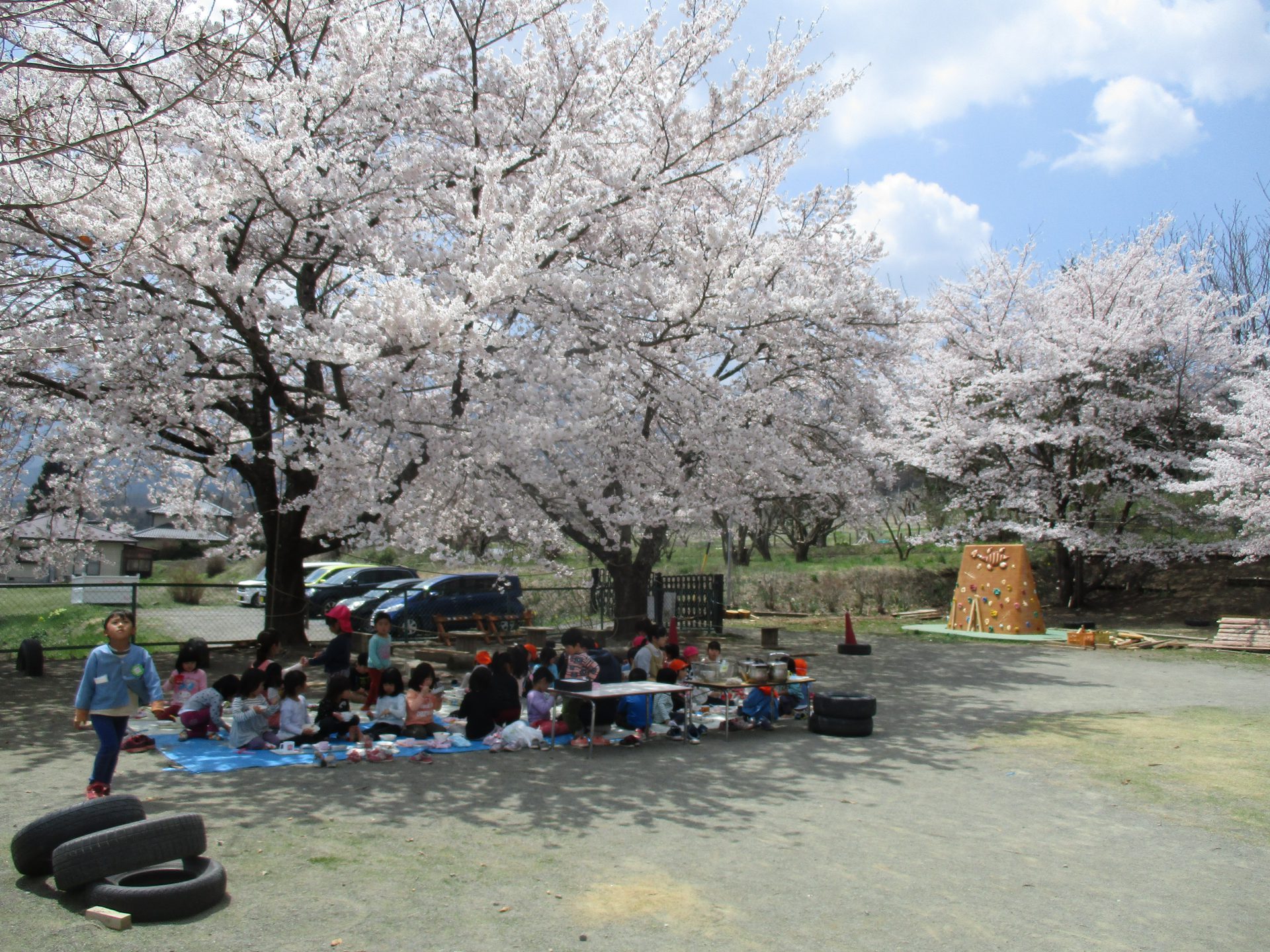山裾にある西箕輪南部保育園にも桜の季節がやってきました。きれいな桜を見ながら幼児全員でお昼を食べました。桜を見ながら園庭で食べる給食はとってもおいしかったです。