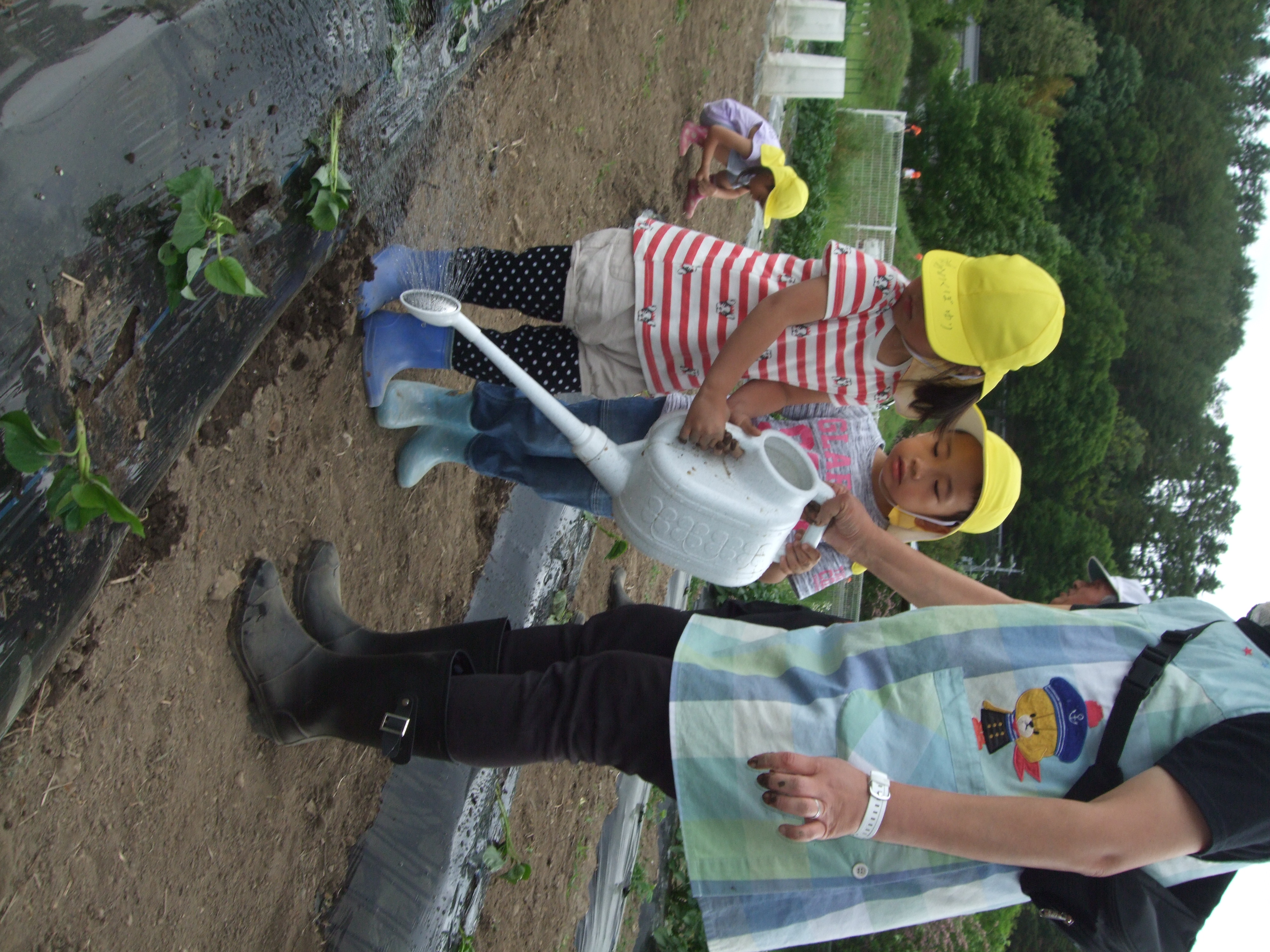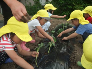 年中組のひまわりぐみ、ばらぐみでは今日、サツマイモの苗植えをしました。
