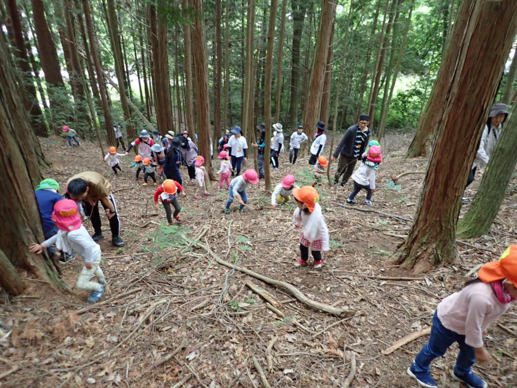 山の広場で子ども一人ひとりが自分なりに(主体的に)そこにある自然物を使って遊びを見つけ出し、近くにいる保育士たちも一緒に面白さを共有してじっくりと遊びこみました。