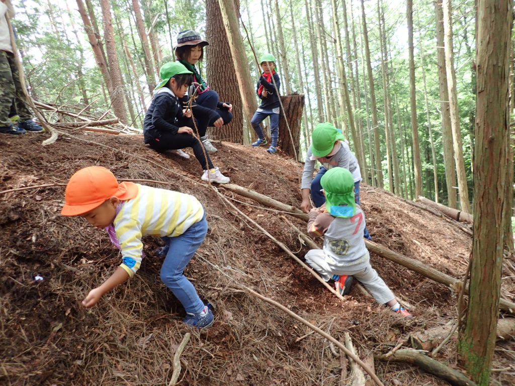 木の枝にひもをつけ、松ぼっくりをエサに見立ててさかなつりごっこが始まりました。大きな木に引っかかってジンベエザメをイメージしながら大物を釣り上げる子どもたち。友だちと力を合わせて引っ張り上げました。
