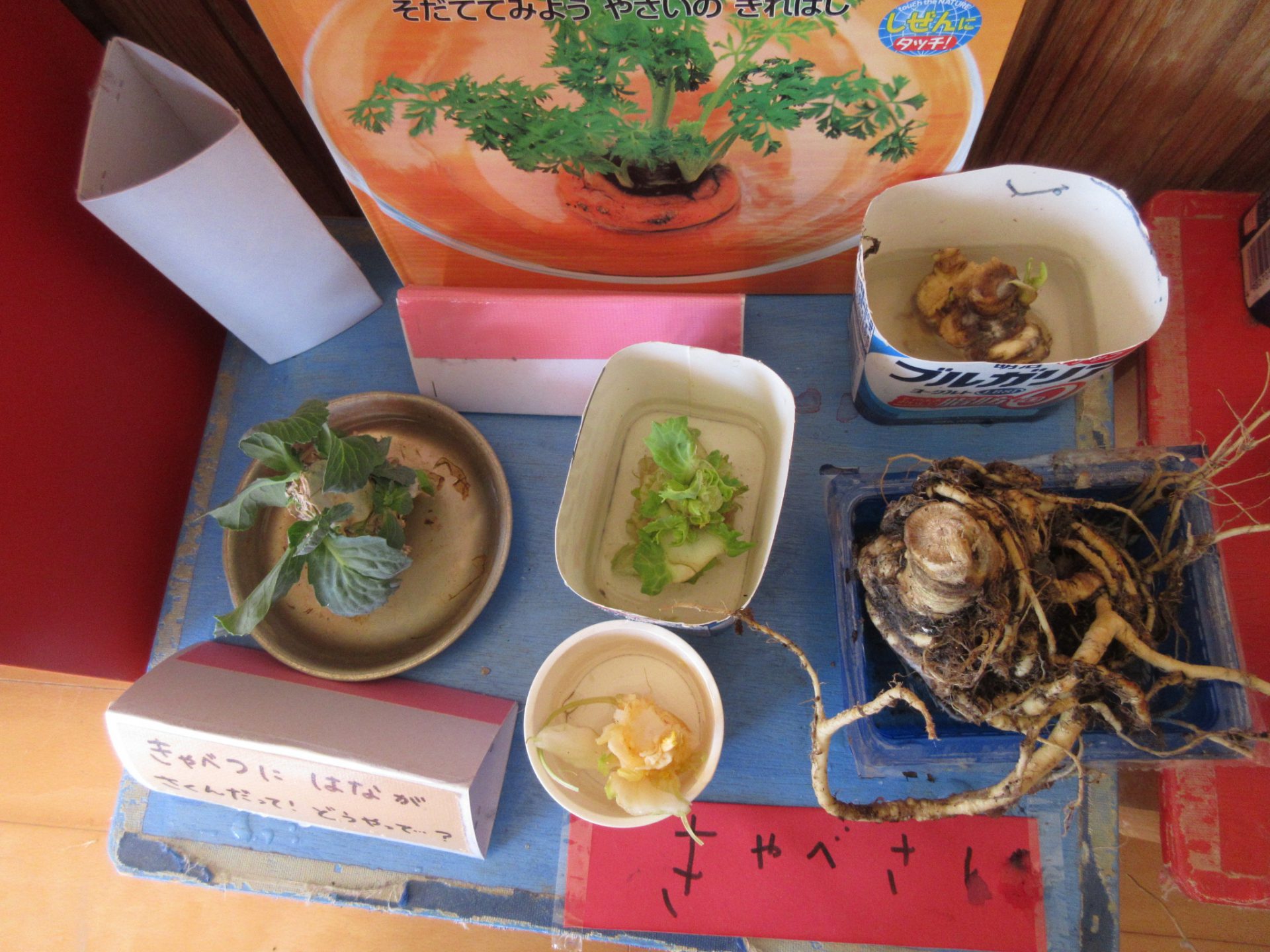 食べ終わった後の野菜のヘタやシンは、「絵本で見たら芽が出るって書いてあったよ」…と子供たちが水に入れて、また目が出るのを楽しみに育てています。