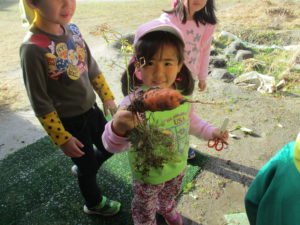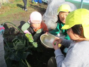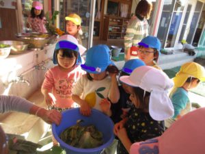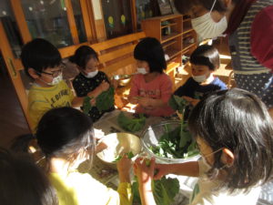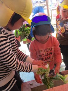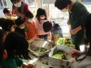 年中・長児が野菜の名前を一生懸命教えてくれると、年少児も興味津々…お手伝いしたい気持ちがいっぱい出てきました。