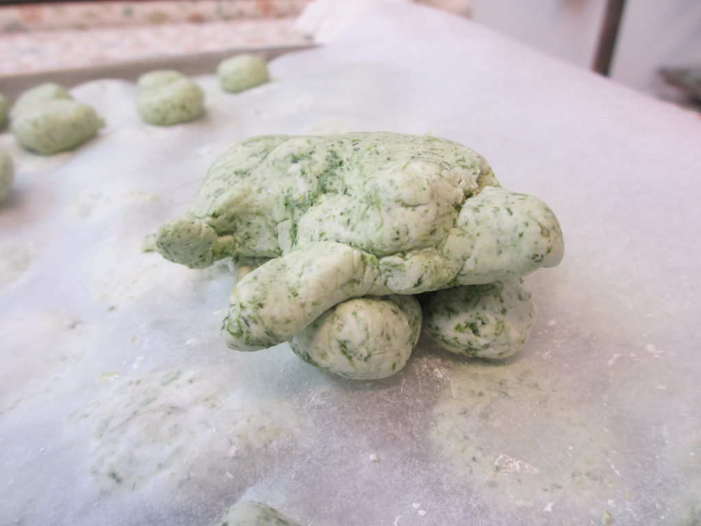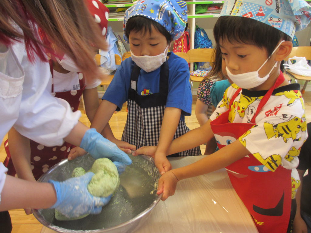 4,5月の散歩でたくさん積んだよもぎで団子をつくることになりました! 白い白玉粉が緑いろになってきたよ!