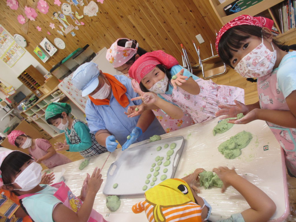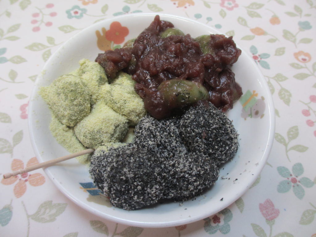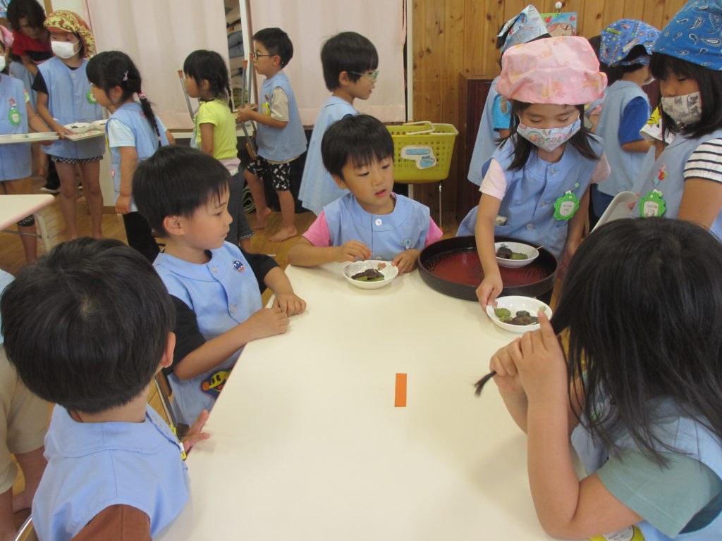 給食室に沢山の団子を届けて「お願いします」 お昼寝中に給食の先生がゆでてくれました。 いつもは寝起きの悪い あの子もその子も今日は目ざめバッチリ!! 手作りあんこに、ごま、黄な粉!!