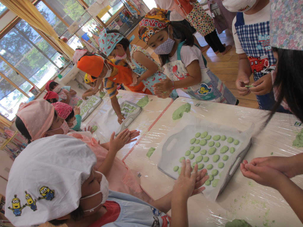 だんだんいろいろな形がでてきました。お花、ケーキ、ハンバーガー、ソフトクリーム等並び始めました! 普段の粘土遊びや団子あそびの成果がでます!