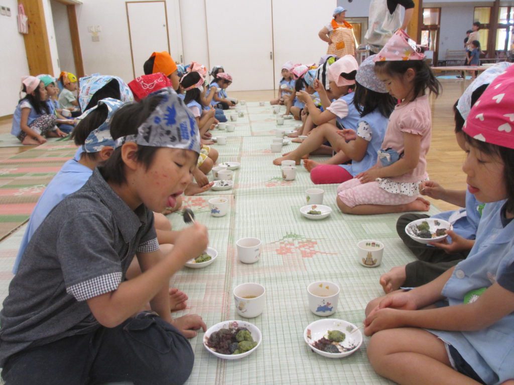 まずは年長さんが食べます 「超うまい!!」「おかわりある?」たくさん食べて腹ごしらえ完了。 「さあ団子屋さんはじめるよ!!」小さい子達へ 団子を届けよう!