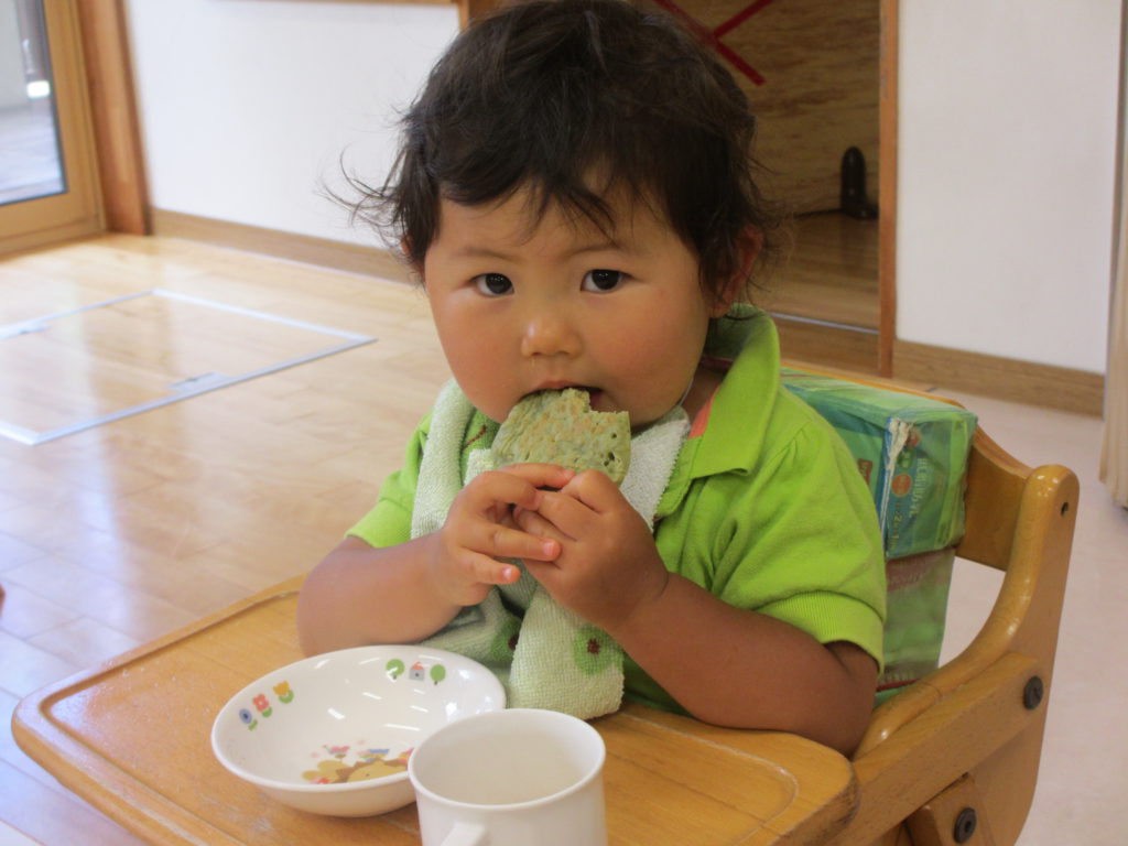 1歳児さんもよもぎたっぷりのパンケーキ。いい香りがするね。おいしいね。 今年のよもぎもおいしかったね😊