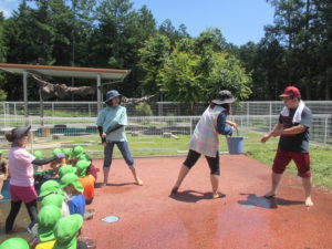 プールの水がなかなか減らない… こうなったら「バケツリレーをしよう!」 「バケツリレーってなに?」 子どもはもちろん、知らない保育士もいたので、 まずは見本を見せます。 「はいっ」「はいっ」かけ声かけてやるんだよ。
