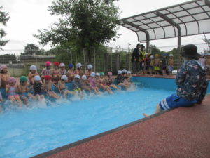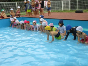 7月1日 曇り空でしたが、プール開きを皆でしました。 ちょっとだけ 泳ぎました。 「うわあ気持ちいい」 「プール きれいだね」