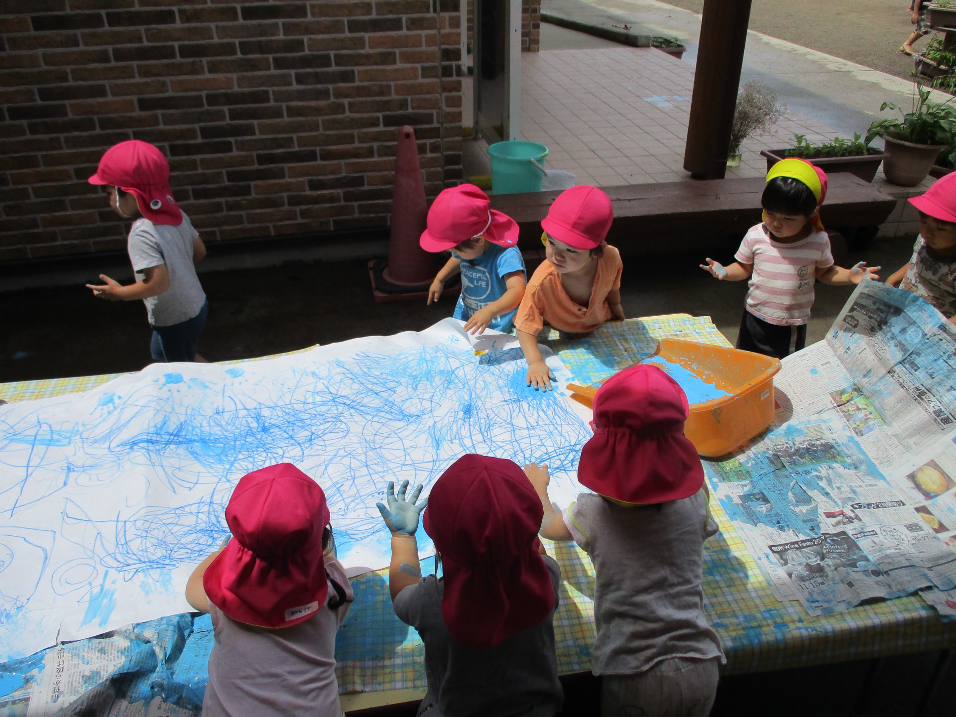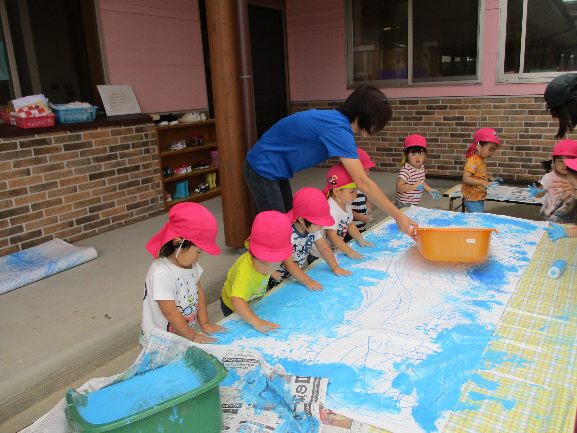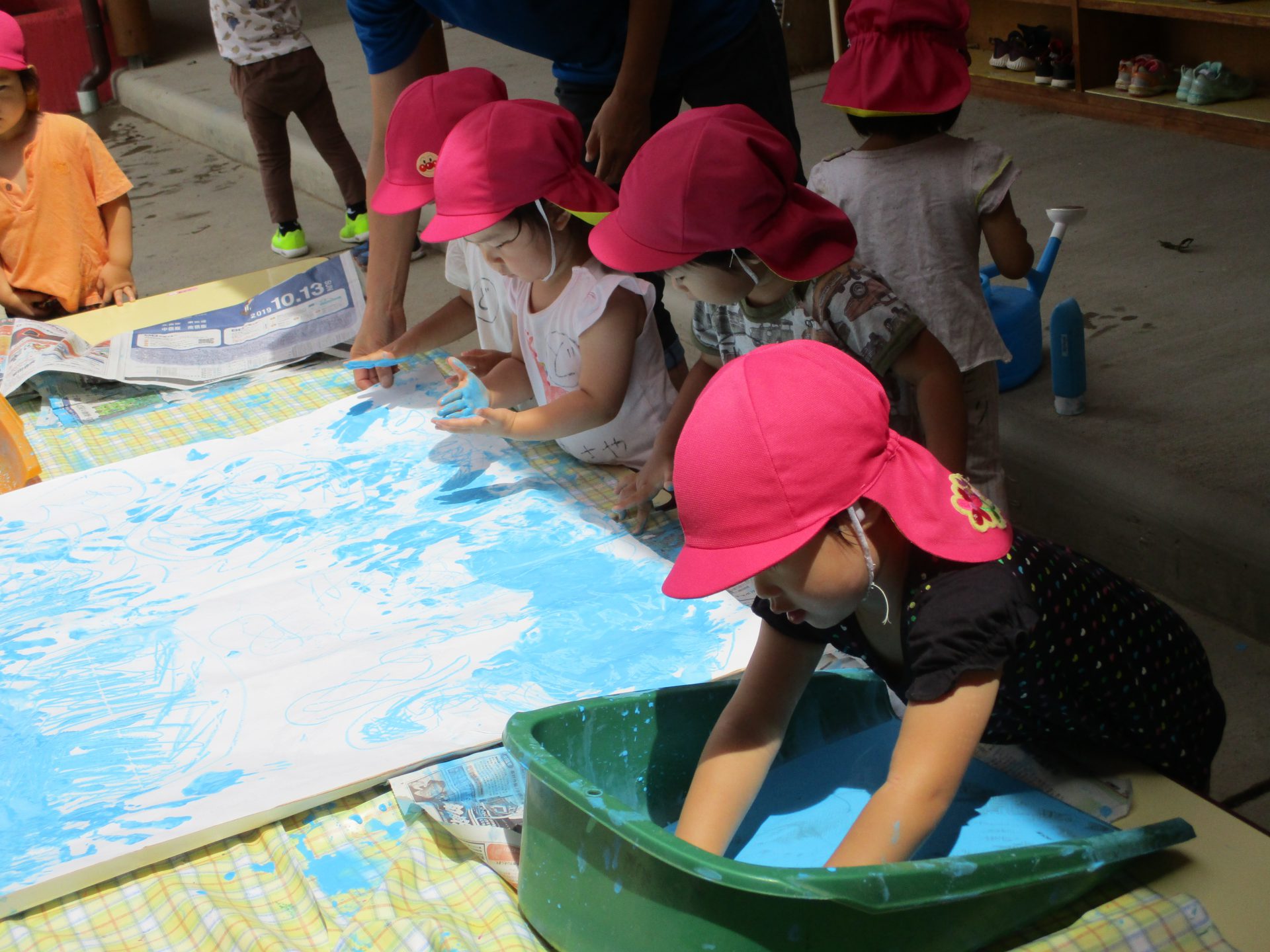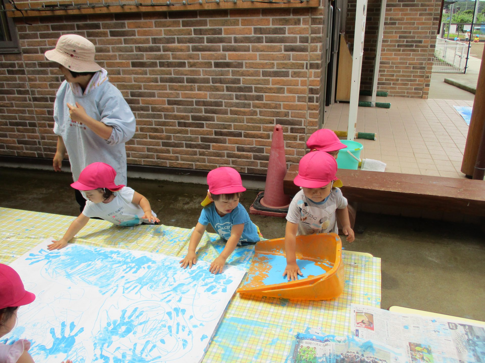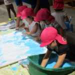 大きな紙にみんなでペタペタ。