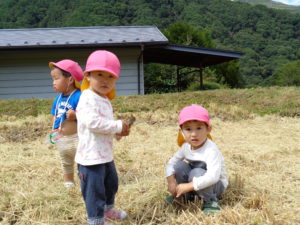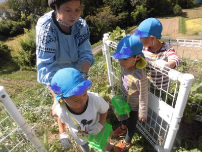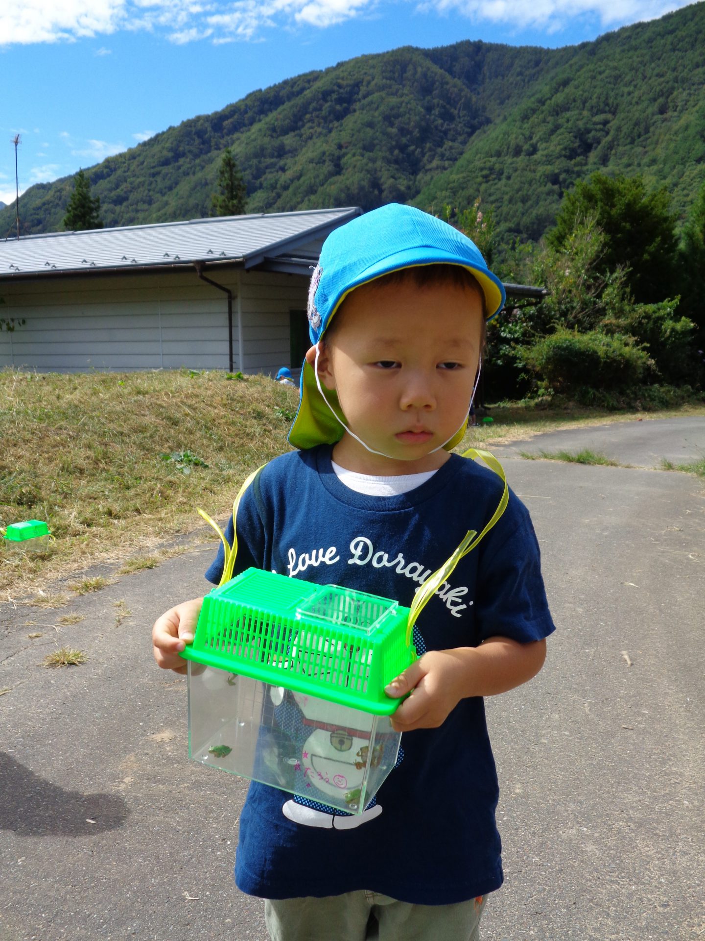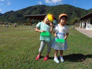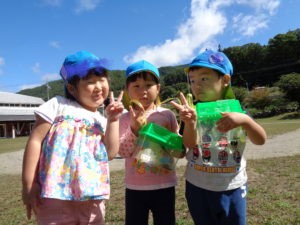 保育園の広~い園庭は、ほとんどが草原。 つまり虫のパラダイス! そして子ども達もパラダイス!! 大人の中指ほどもある大きなショウリョウバッタが、ばったばったと跳ね回っています。本当です。 年少の子達も自分で捕れるようになりました。