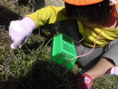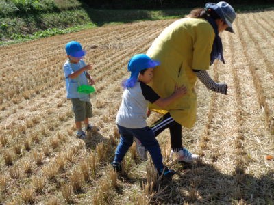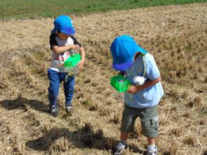 隣の田んぼをお借りして、イナゴ捕り。 先生の技をよく見てね。