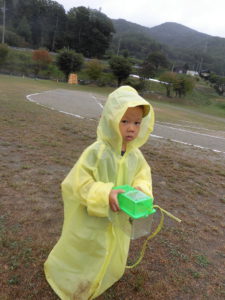後日、虫捕りをしていて、雨になってしまいました。 園用のカッパを着て、年少組全員で雨降り散策としゃれこみました。 満足なAくんです。