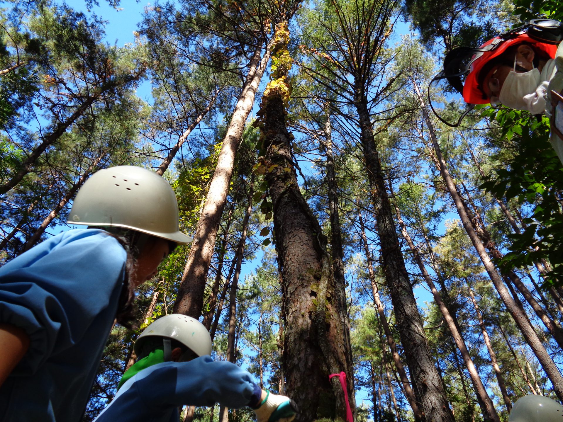 作業が終わって、お話を聞きました。大きい木の名前や年・・・これは赤松で、70歳くらい。