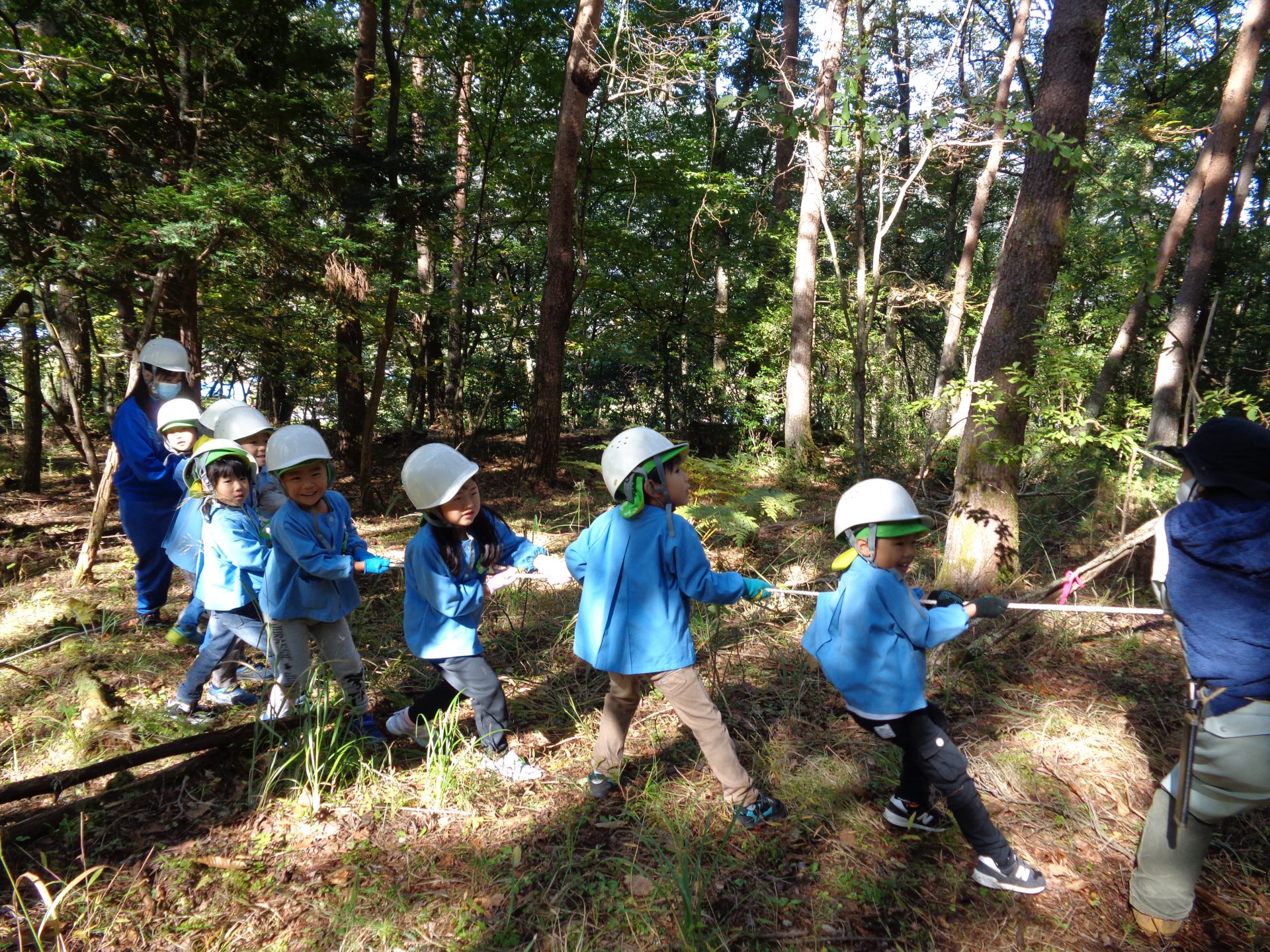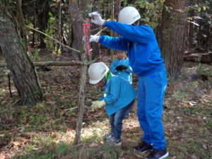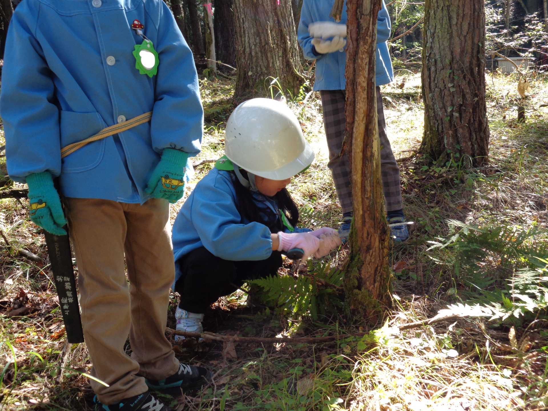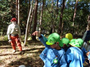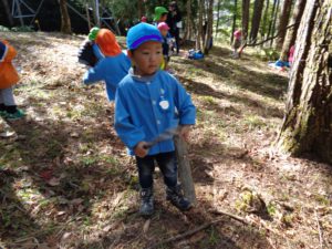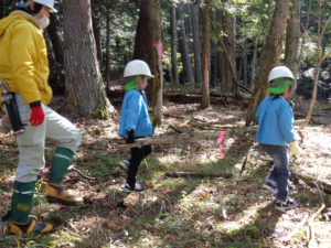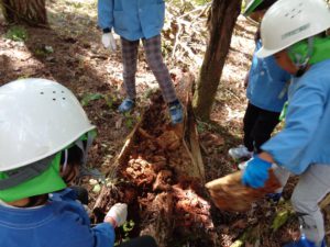 広場を作る作業を年長組が行うことにしました。地域振興局林務課の方の力強い後押し