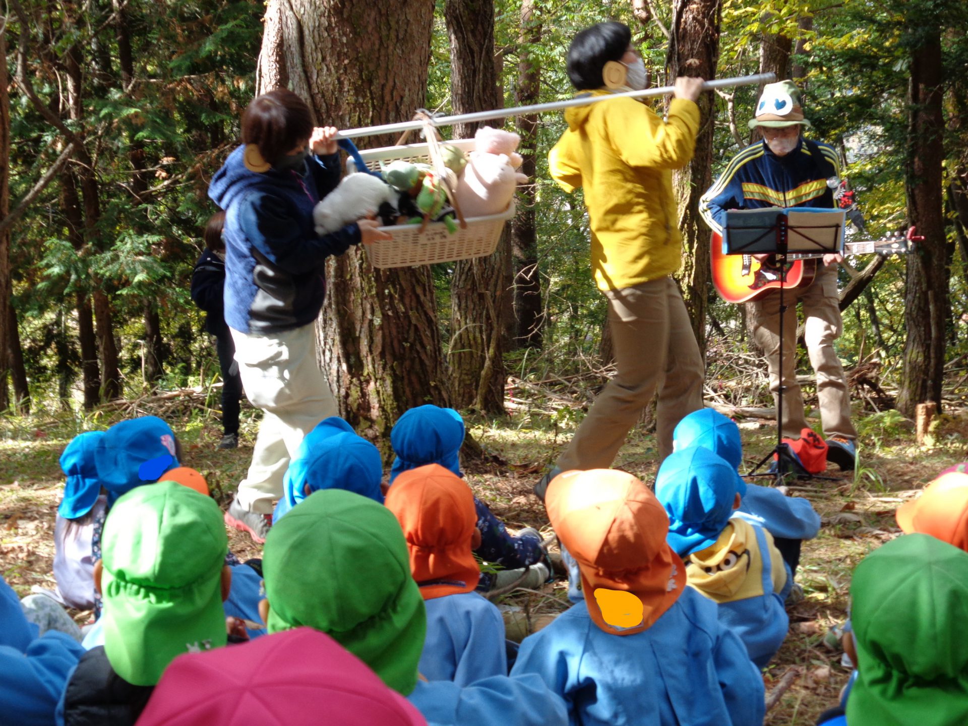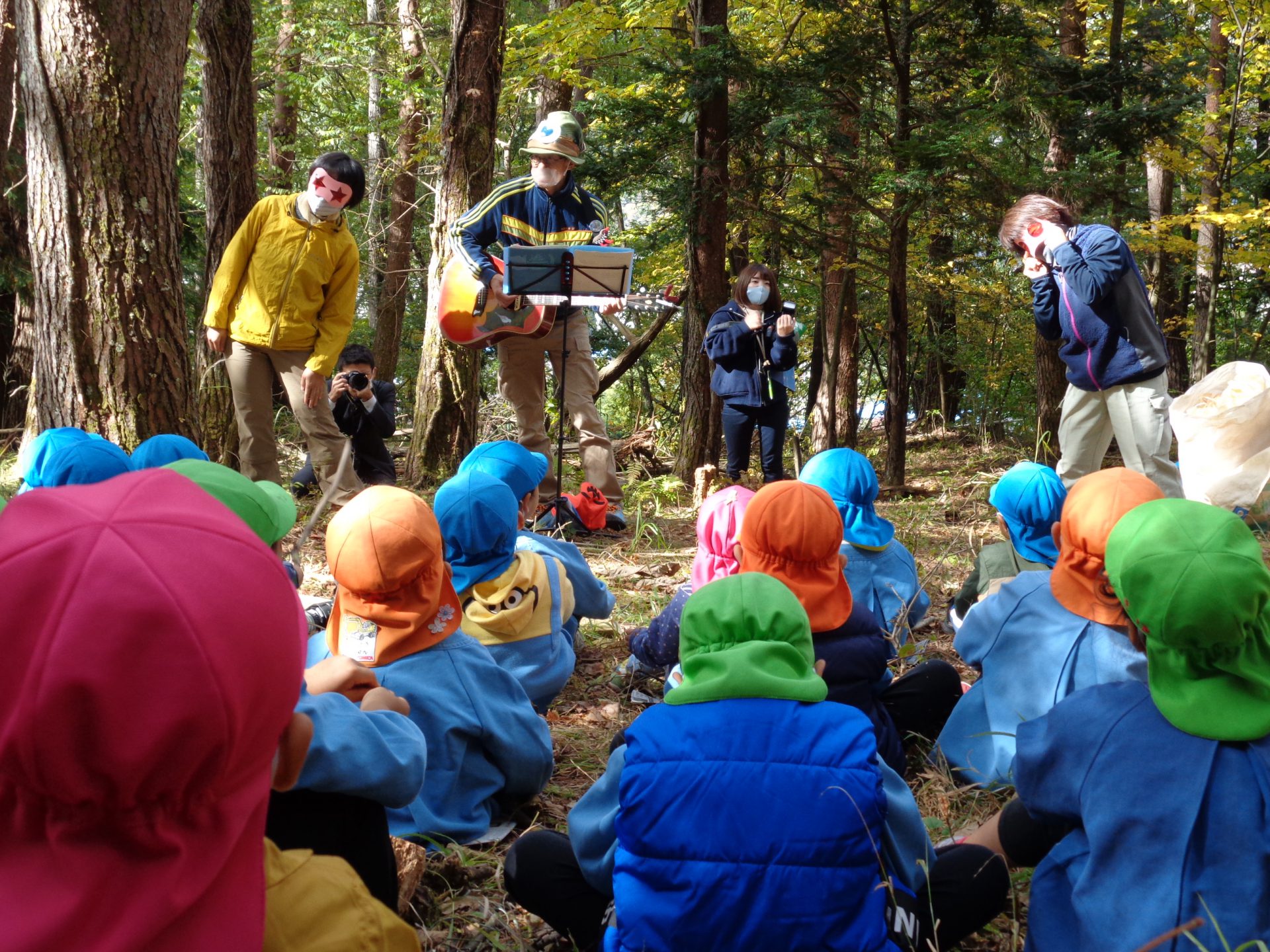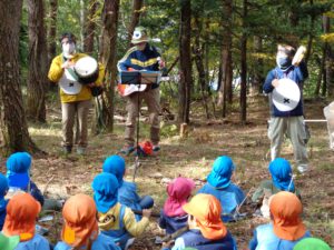 大喜び。ギターの優しい音と、子どもの歌声が山に響きます。保育士のウサギや木の笛も