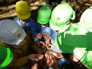 子ども達も音で参加するために、探し物。枝をたたこうかな。はっぱでカサカサするのは