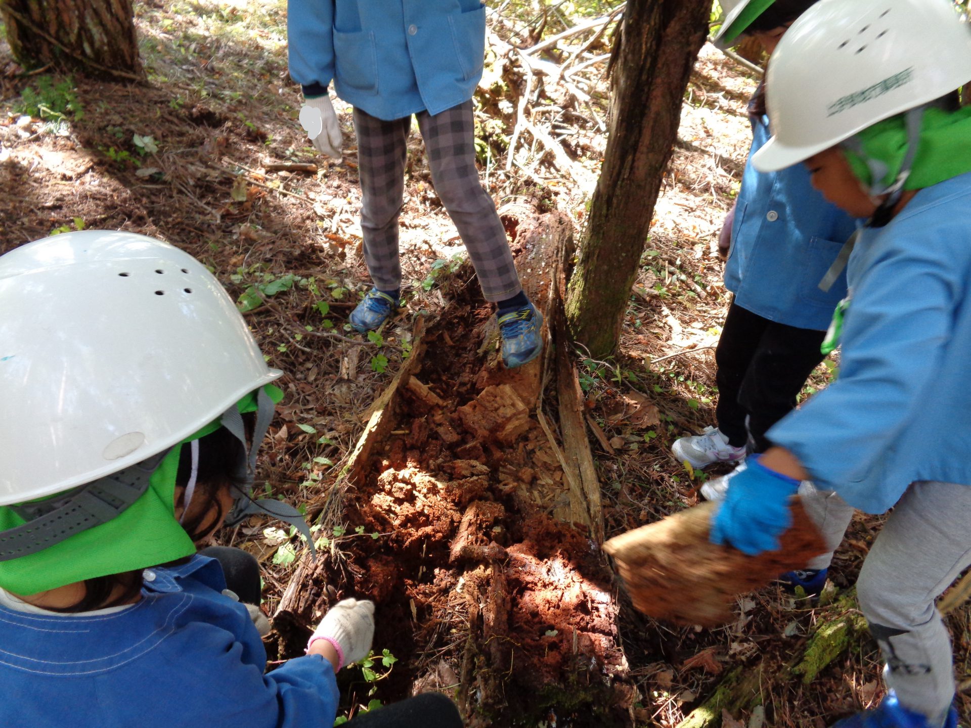 伐った木、枯れた枝を運びます。長いのは協力しよう。枯れた木の中は、ふわふわだね。