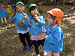 どうかな。どの木がいい音するかな。・・・年少組の子は、張り切って大きい木を持って