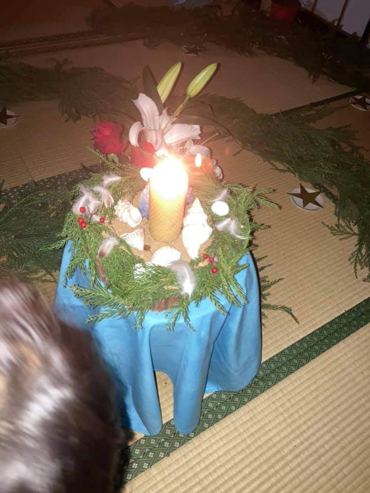 真っ暗なお部屋の中、渦巻きの道の中心にある命のローソクの灯しだけがたより。子供達は、ひとりづつ勇気を出して自分のローソクを持って灯火を貰いにぐるぐる渦巻きの中に歩き出します。不安や怖さを克服し、一歩、また一歩。そして、命のローソクに辿り着き、ようやく自分のローソクに火を灯した時、子供達は、ほっとした顔つきで、渦巻きの道を慎重にかつ足早に帰ってきます。お部屋の中は、段々とみんなのローソクが灯され、美しい光に包まれます。そして、暗い闇に打ち勝った子供達の姿は、勇敢で、またひとつ大きく成長したように感じます。