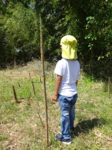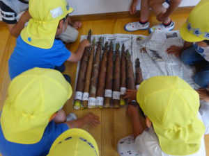 保育園に帰ってからは、採ってきた淡竹の背比べ! 「ぼくの、たけのこが一番ながーい!」「わたしのは、一番太いね!」