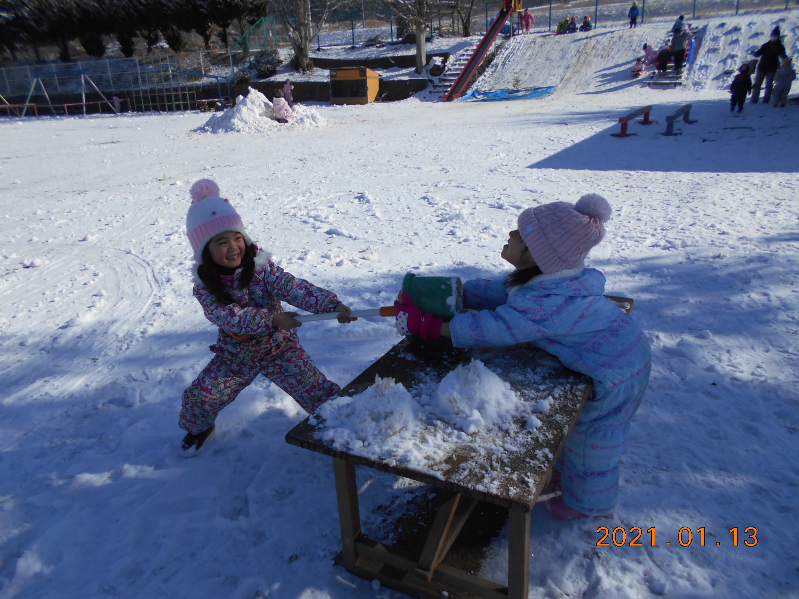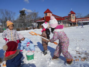 雪が庭に積もると、ソリ遊びやかまくら作りなどして遊ぶ姿がみられました。