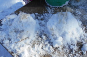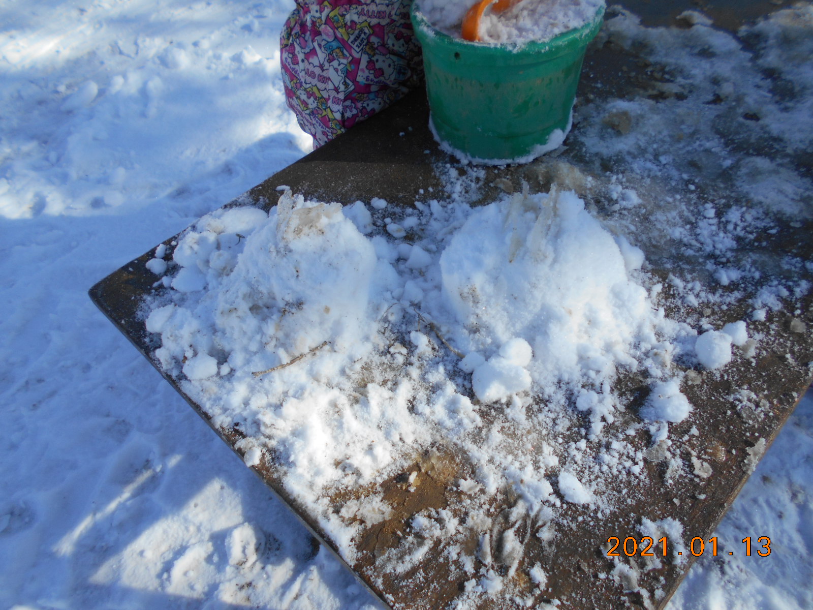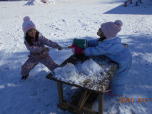 ❝杵は、シャベル❞ ❝臼は、バケツ❞ ❝おもちは、雪❞ に見立てて、年中児と未満児が一緒に遊んでいました。