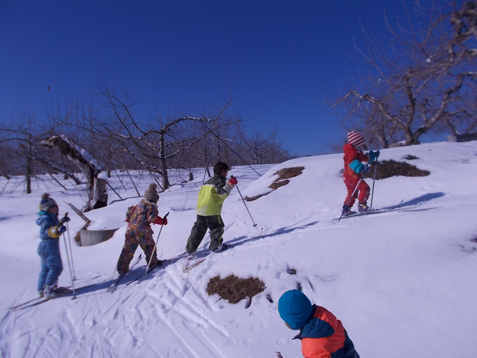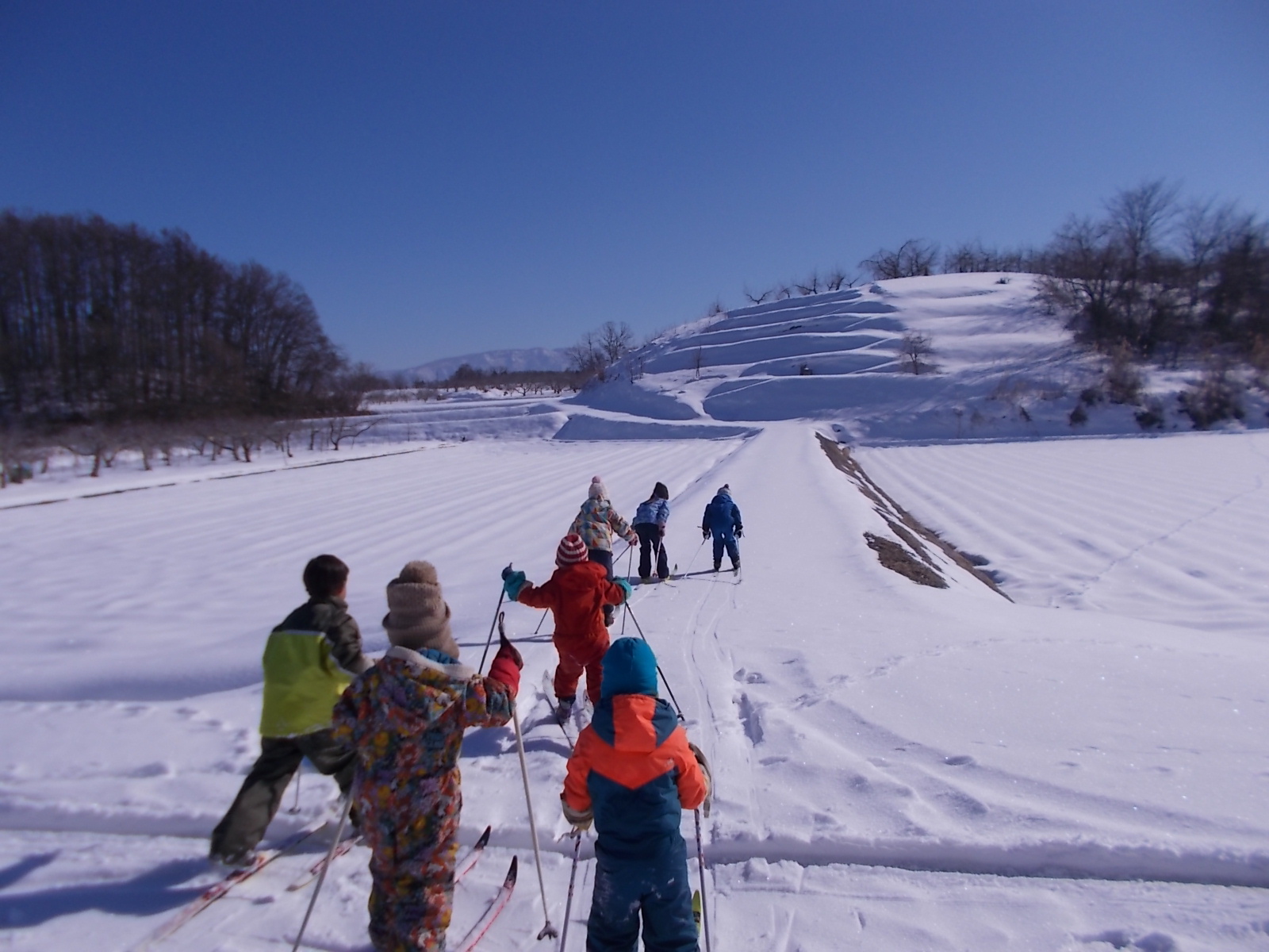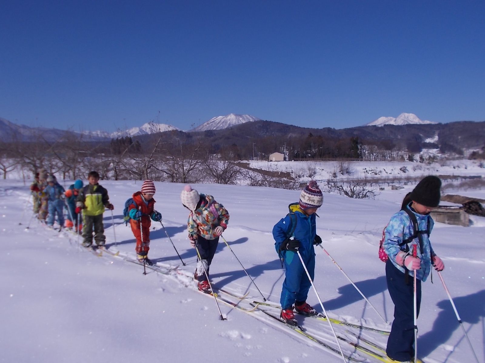 今冬は、年末から雪に恵まれているお陰で、昨年から歩くスキーを楽しめる環境。絶好のお天気に恵まれ、お弁当を背負い、大地から果樹園 雑木林 林道を歩き、動物の足跡だらけの田んぼを横切り、誰も踏み入れていない雪野原を歩く。青空 静寂 雪のかぶる針葉樹林 美しい北信五岳 その中に 子ども達の姿が浮かび上がり、歓声がこだまする。転ぶ事が楽しい歩くスキー。冬の野山は まさに自然と一体となる毎日である