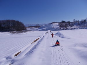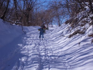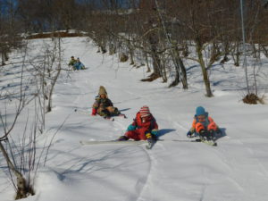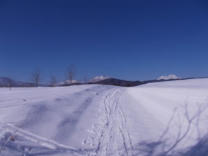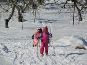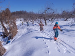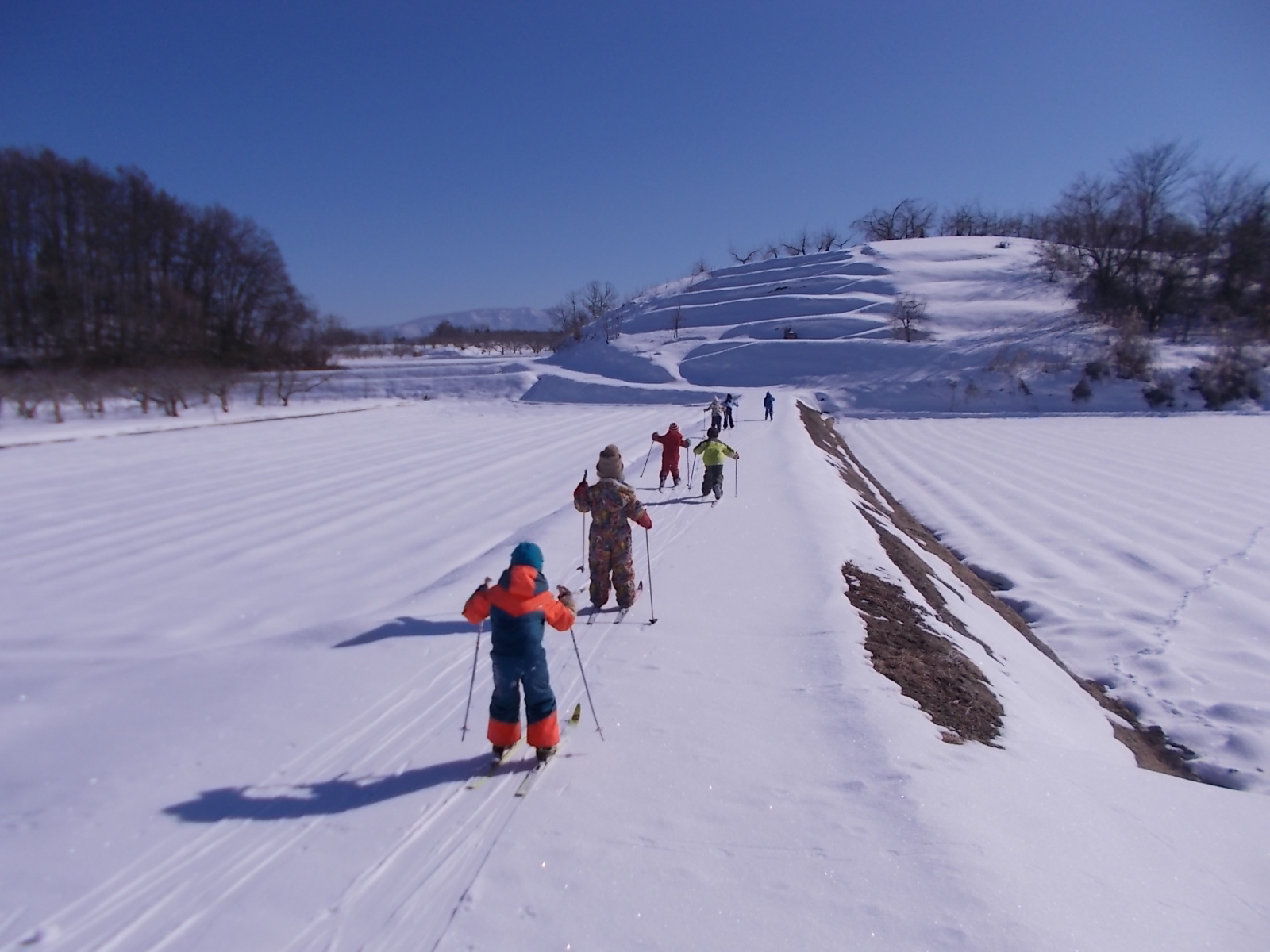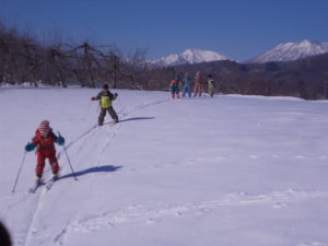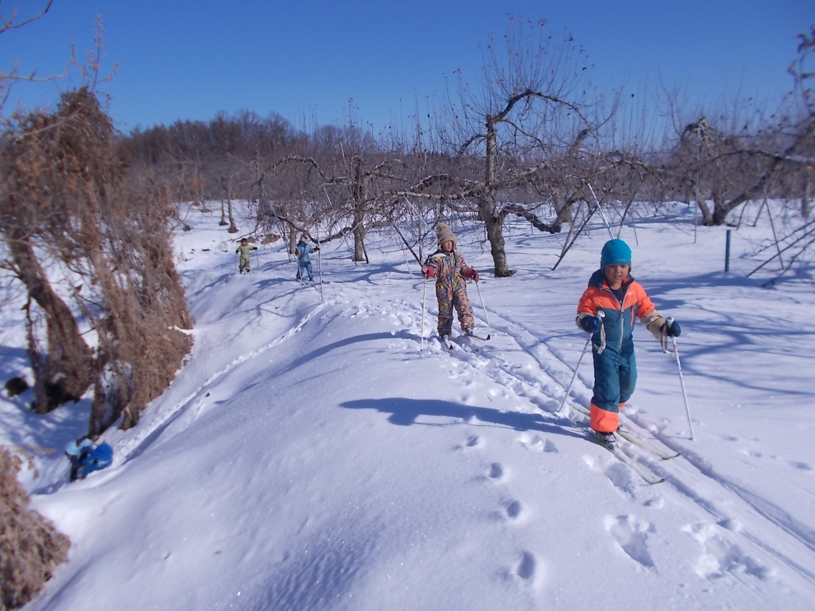 今冬は、年末から雪に恵まれているお陰で、昨年から歩くスキーを楽しめる環境。絶好のお天気に恵まれ、お弁当を背負い、大地から果樹園 雑木林 林道を歩き、動物の足跡だらけの田んぼを横切り、誰も踏み入れていない雪野原を歩く。青空 静寂 雪のかぶる針葉樹林 美しい北信五岳 その中に 子ども達の姿が浮かび上がり、歓声がこだまする。転ぶ事が楽しい歩くスキー。冬の野山は まさに自然と一体となる毎日である