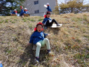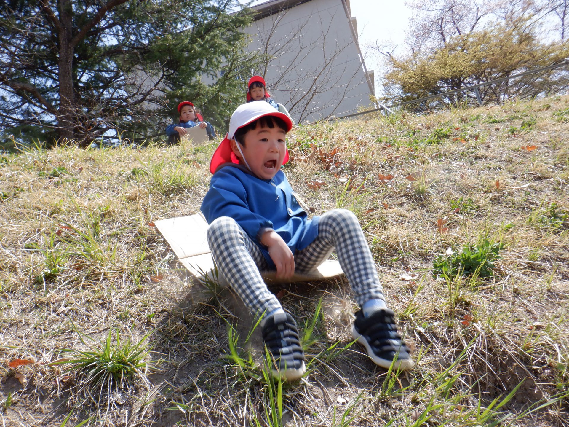 土手に行って坂滑りをしました。 段ボールをお尻の下に敷いてたら、すべるすべる! スリルをお友だちと共有して楽しみました。