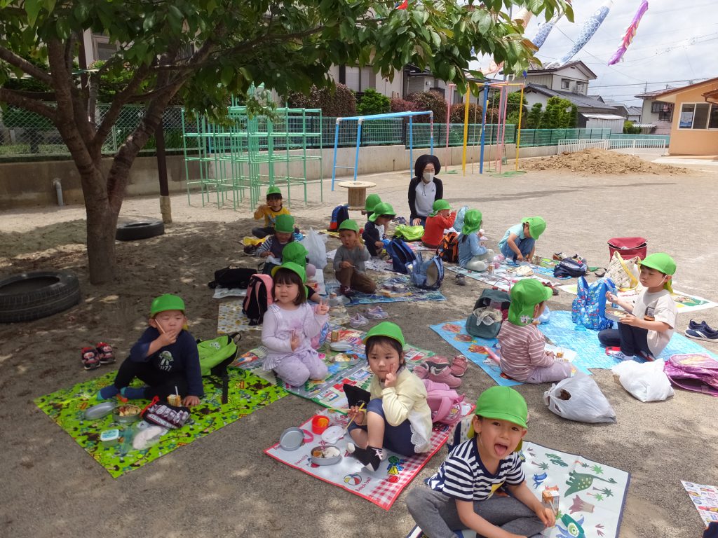 お昼は園に戻り、園庭の桜の木の下で食べました。