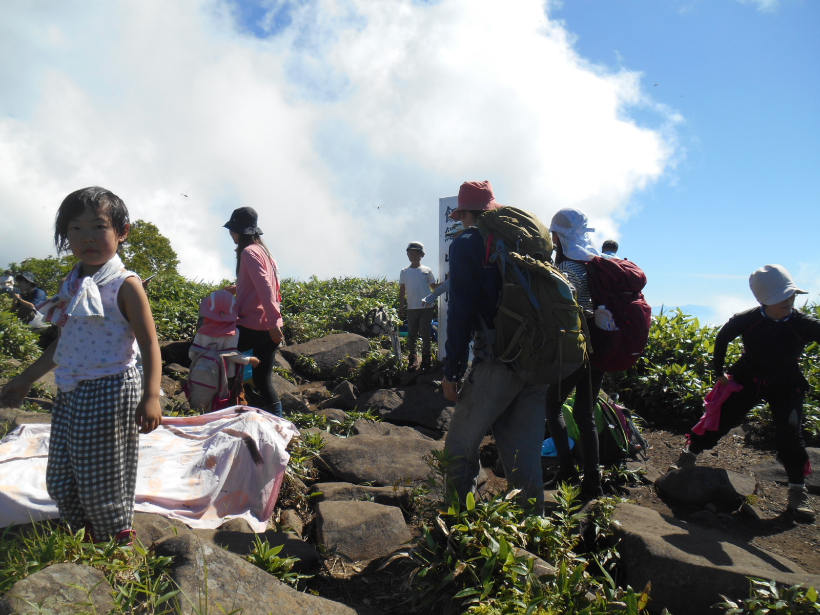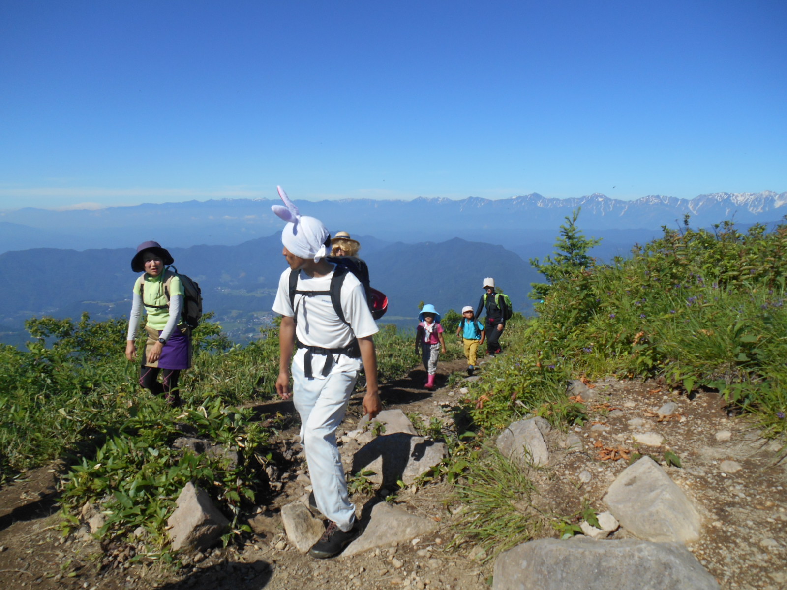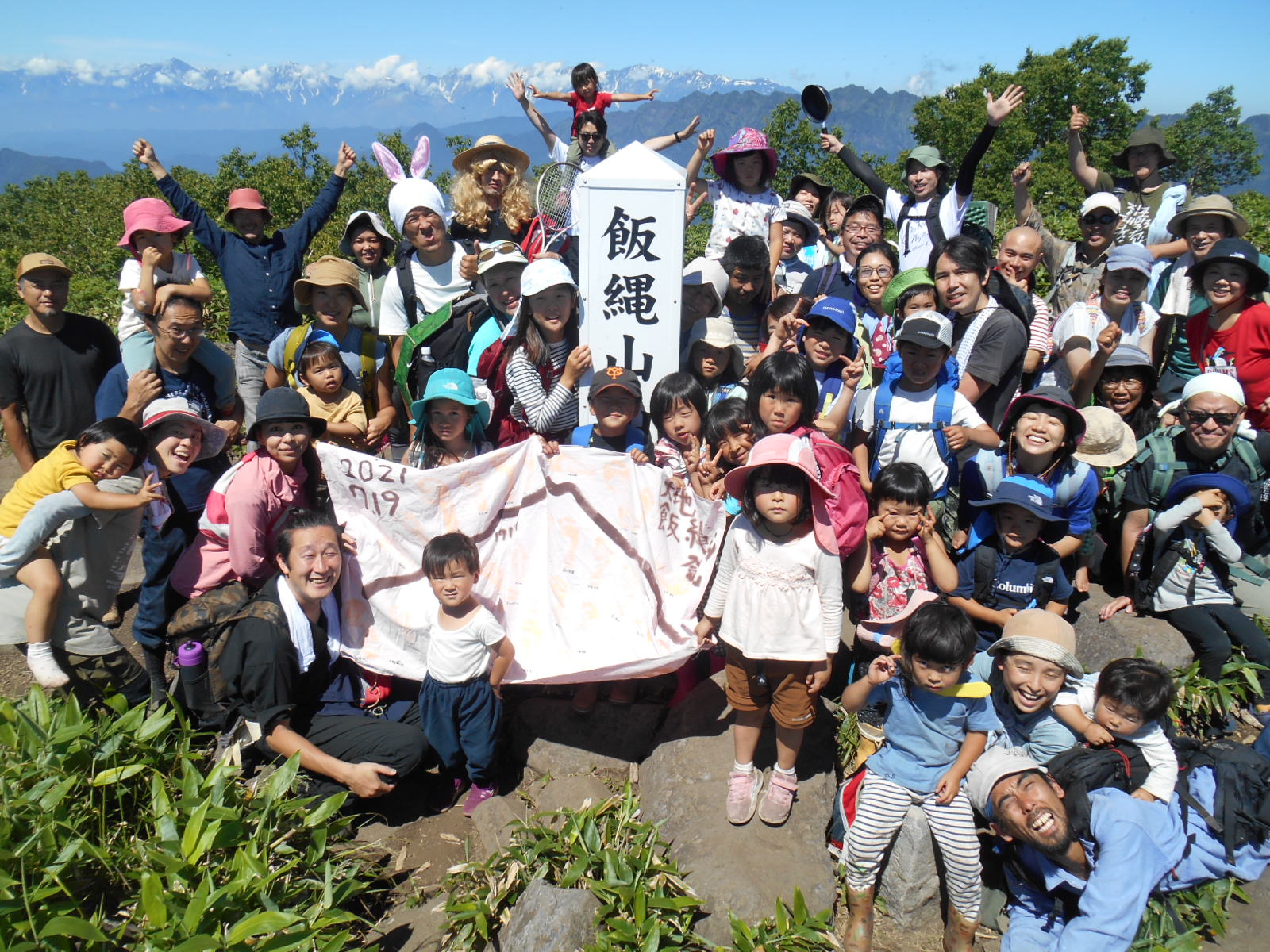 2年ぶりの親子登山。今回は 飯綱山を選択。朝6時集合。未満児から年長児まで親子で挑む。標準タイム2時間30分を、3時間30分に設定して、年少児は おんぶ紐を持参し、スタート。登山が、嫌いにならないように、集団では無く、あくまでも家族のペースで登る。スタッフは 先頭 中盤 しんがりについて、励まし タイム内登山を励ます(雷雨などに備え)。五合目あたりから、富士山 浅間山 八ヶ岳などが見え、7合目の森林限界からは、北アルプス 白馬三山 槍ヶ岳 穂高連峰などもくっきり見える。頂上には 年長児などは 8時40分 最後の年少児は 9時半には登頂。持参したおにぎりを頬張り 登頂を味わった。持参した旗を中心に記念撮影。10時10分下山開始。無事最終の年少児は、午後1時下山。全員無事下山。