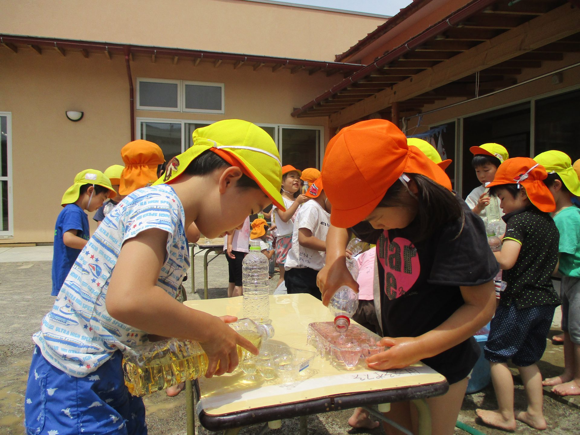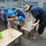 自分のボトルに一生懸命入れるかわいい姿です。年中さんは卵パックに上手に注ぎ入れています。