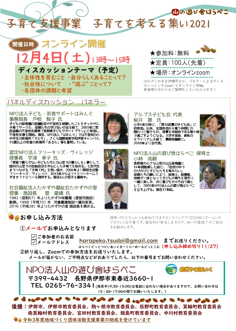 山の遊び舎はらぺこ主催の『子育てを考える集い」のご案内です。