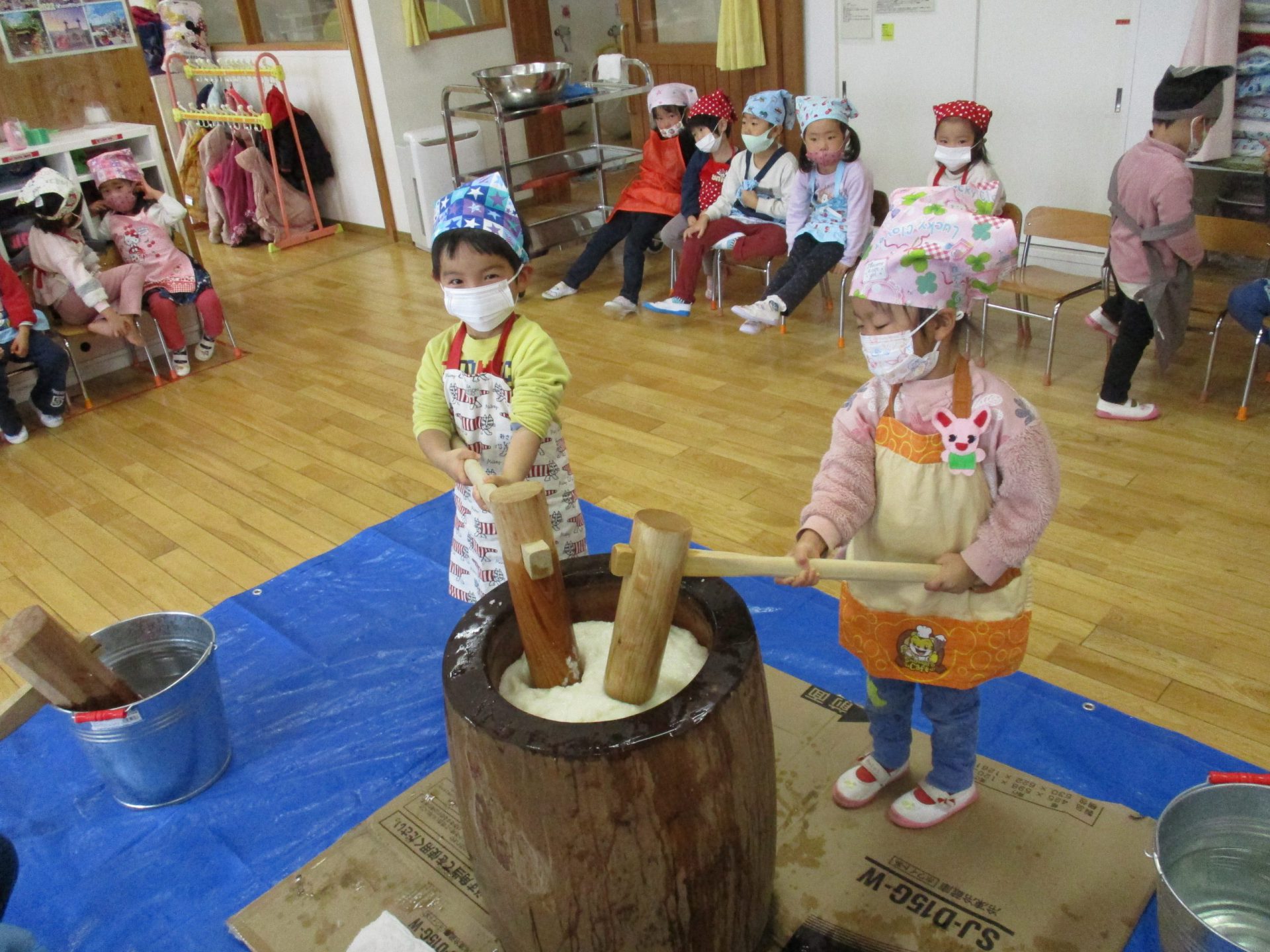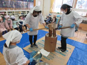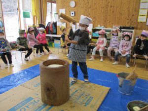 1月は餅つきまずはもち米をよくでっちます!この作業が餅つきの肝!よくこねることでなめらかなお餅になるのです