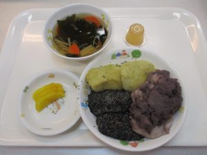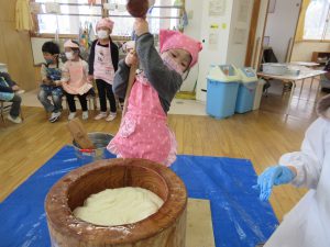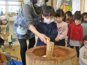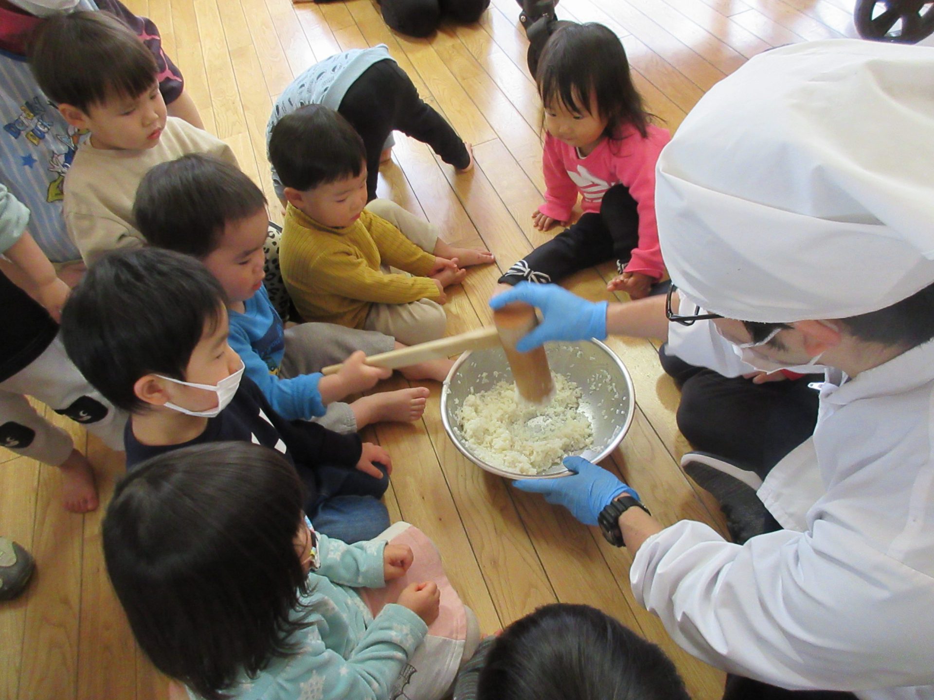 もち米のおこげをよけておいたのを見て、「これもお餅にならないかな」と保育士がお湯をいれてついてみました。なんと!おはぎのようになってきたのです。0.1歳児さん達もじっと見て、ぼくも私も…皆でついたのですよ💪