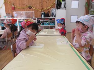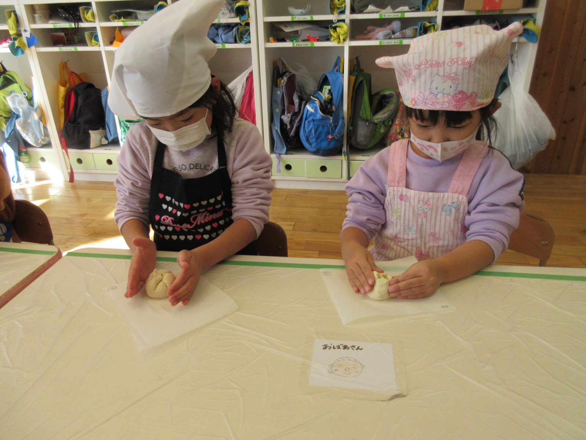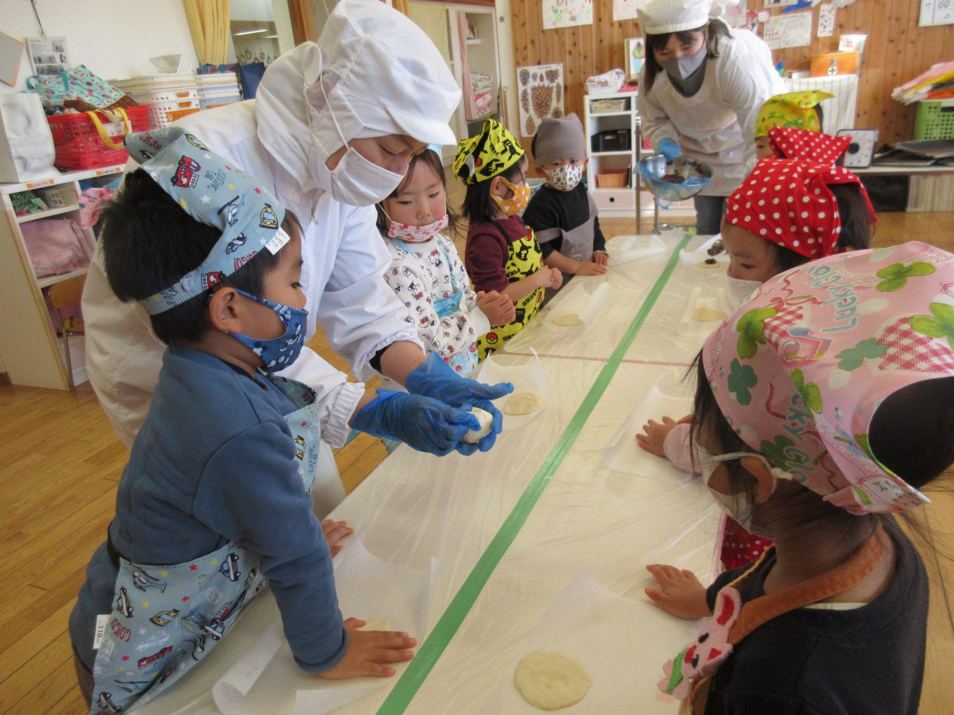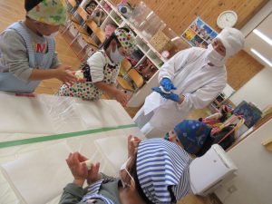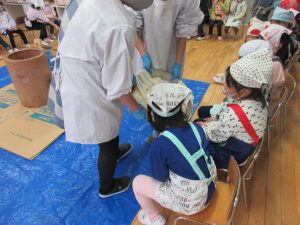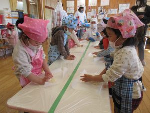 さすが年長さん!大人がいろいろ言わなくても真似をしながら生地の上をキュッキュとつまんで側面をくるくるとまわして高くします。