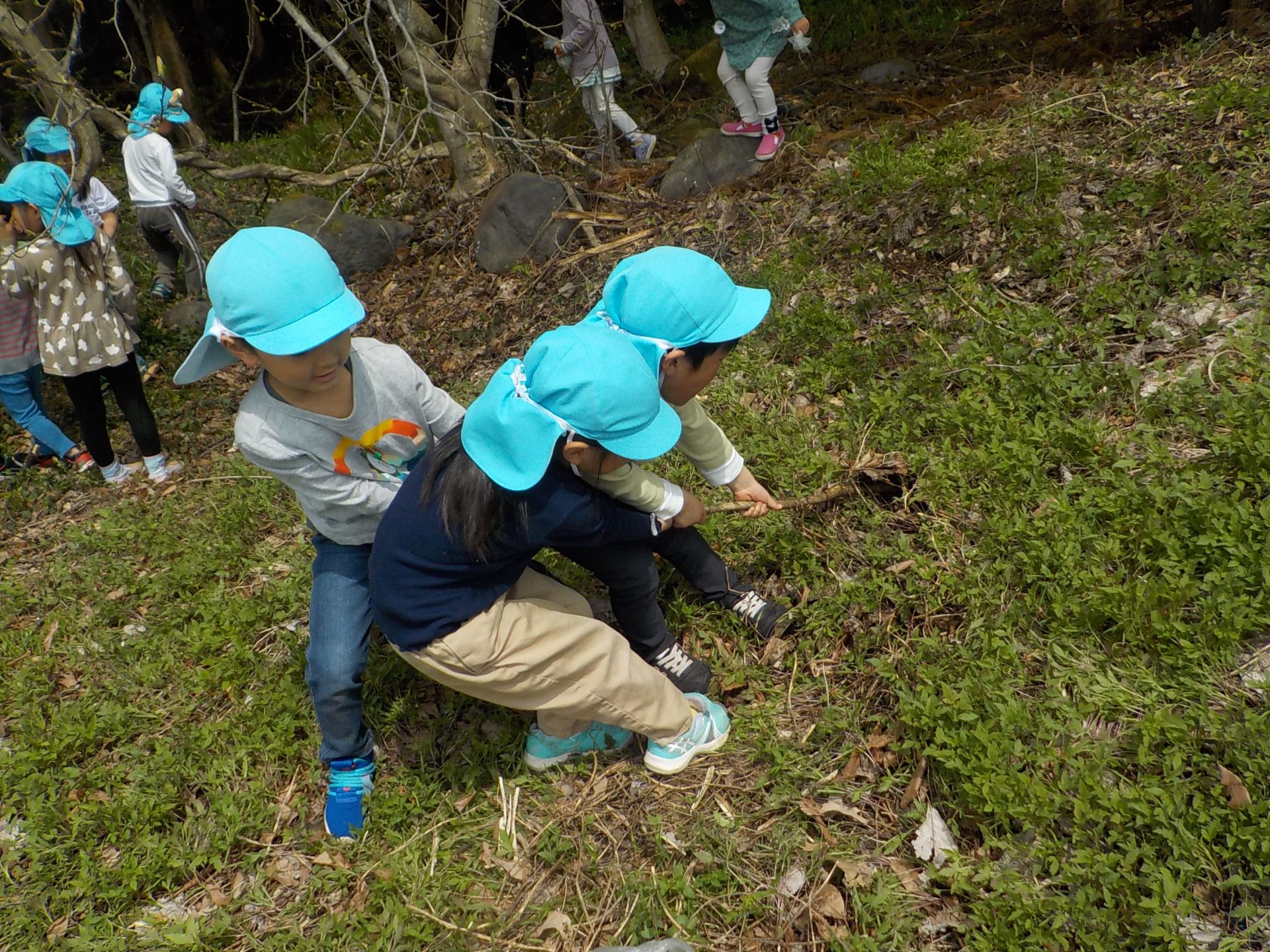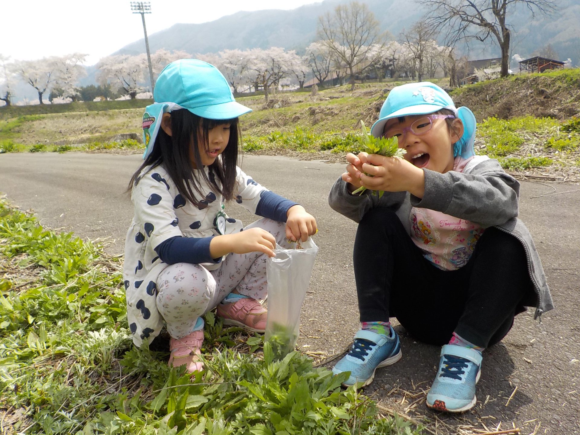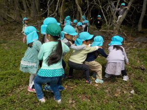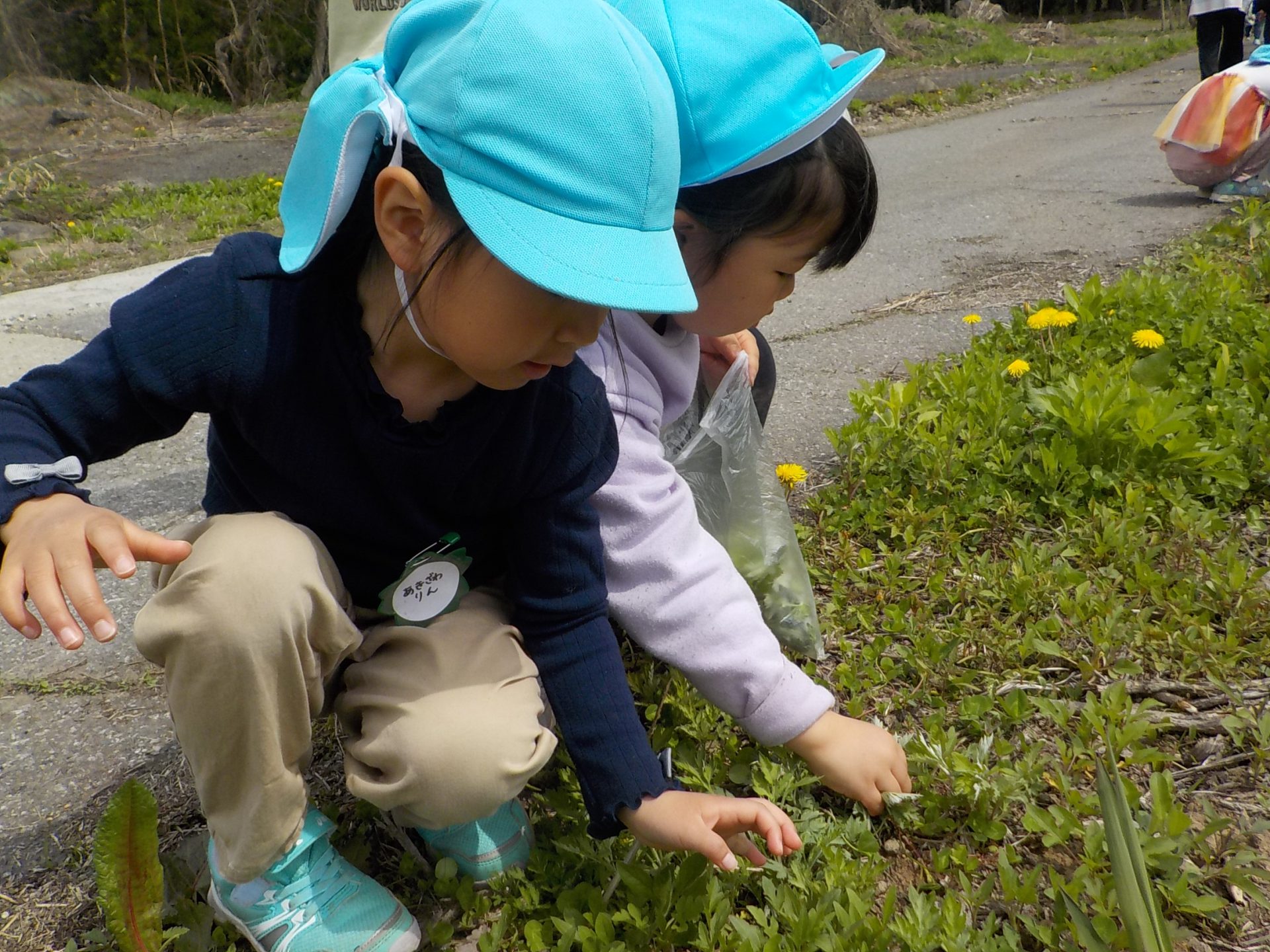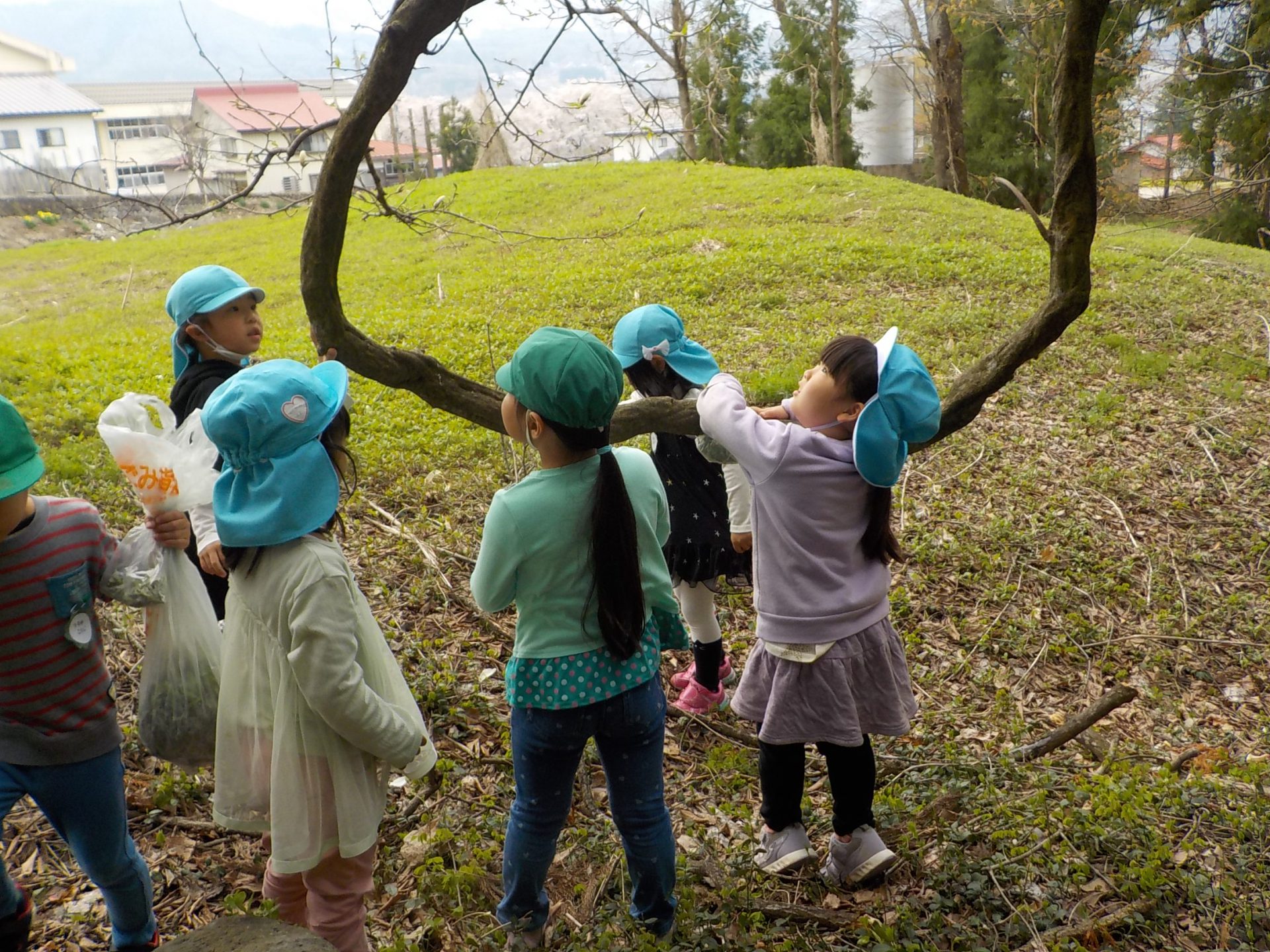 4月の晴れた日、年長組がヨモギ団子を作るための「ヨモギ」を取りに出かけました。