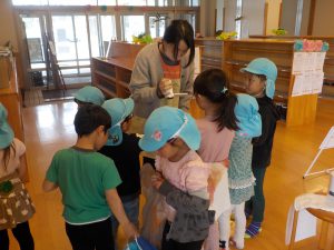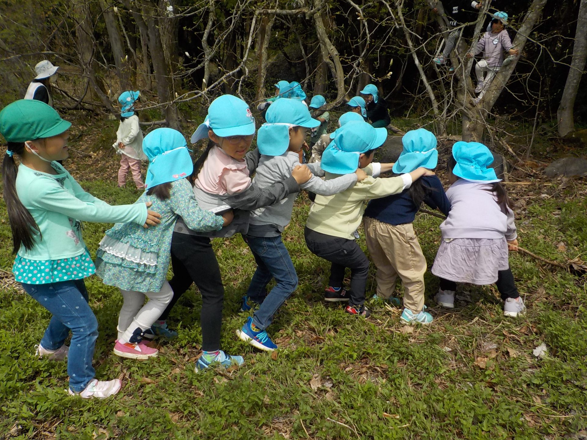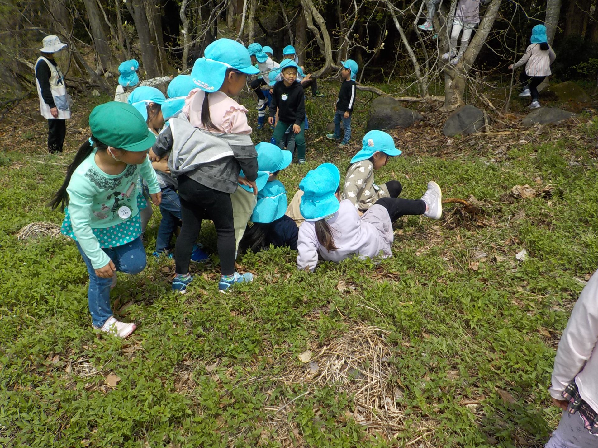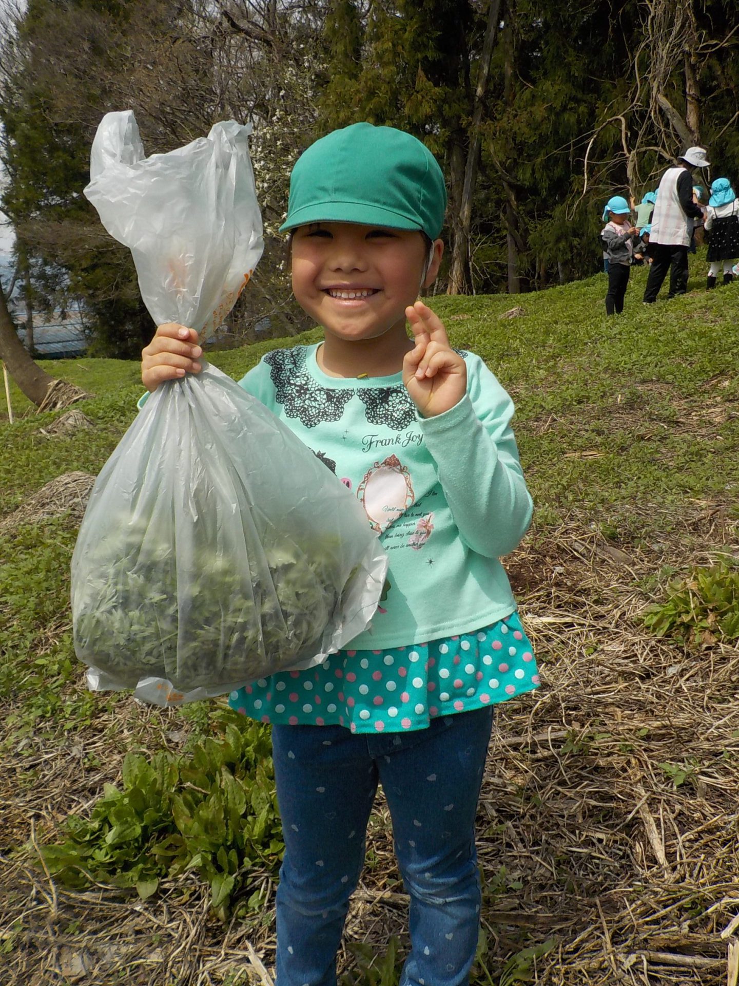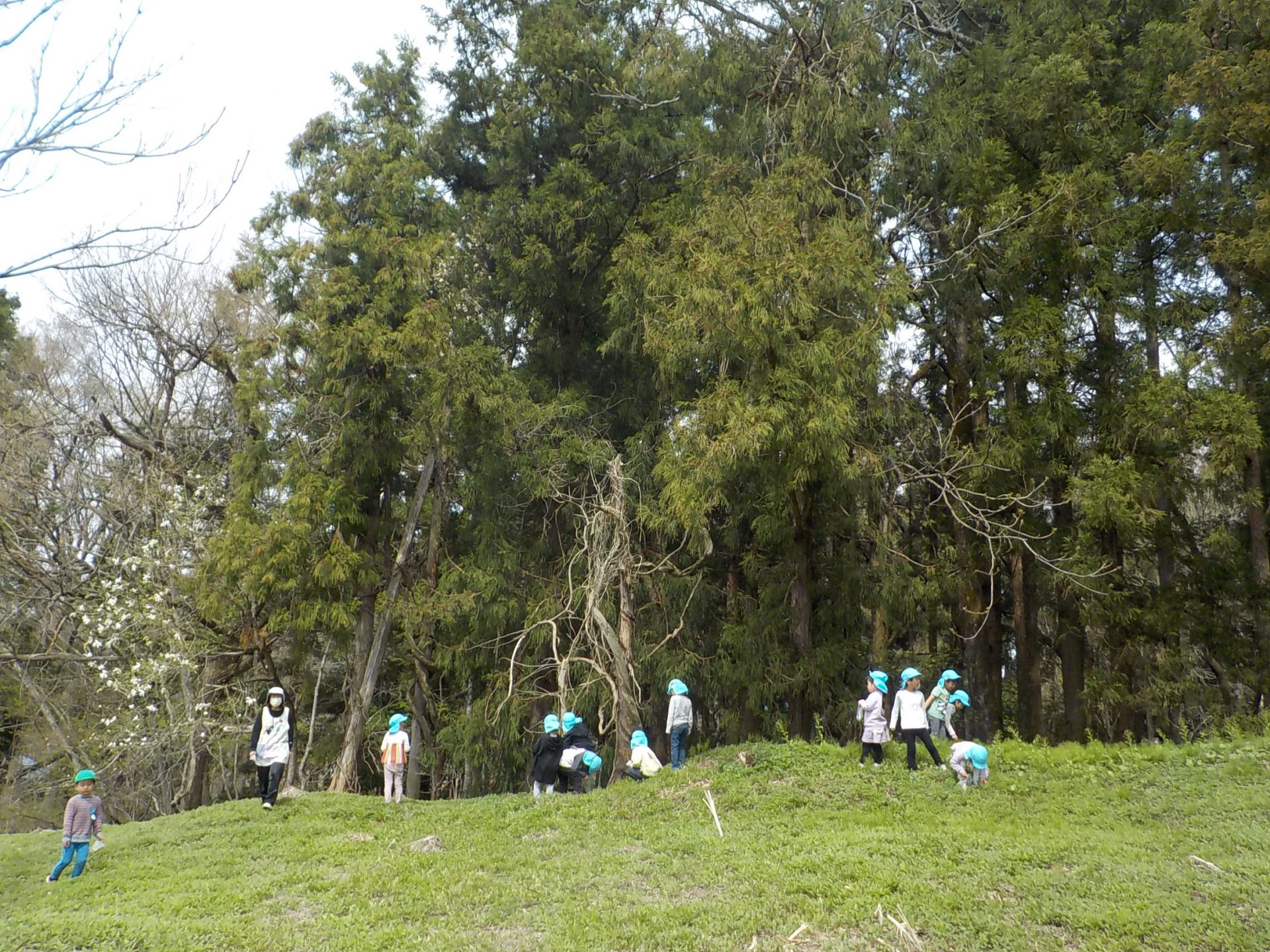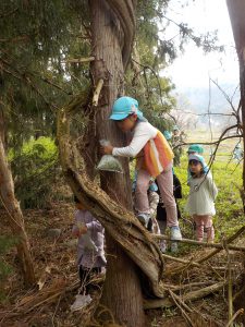 4月の晴れた日、年長組がヨモギ団子を作るための「ヨモギ」を取りに出かけました。