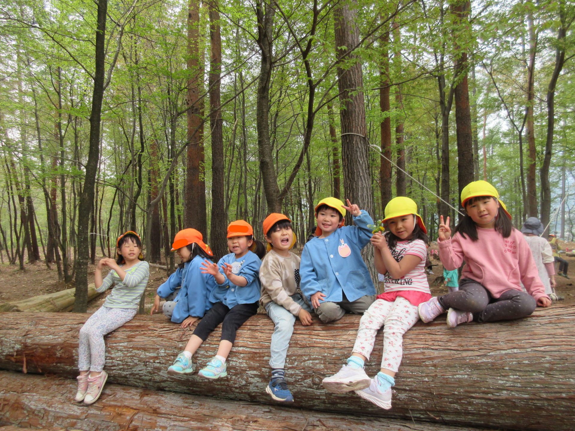 老松場の方々は、山の手入れもしてくださっています。その中の古墳公園は、保育園のすぐ裏にあります。手作りのアスレチックもあるのですが、自然な林が残っていて、大きな木が切り倒してあり、早速皆で登り始め、「御柱みたい!よいさ!よいさ!」と。おしゃべりもはずみますね。