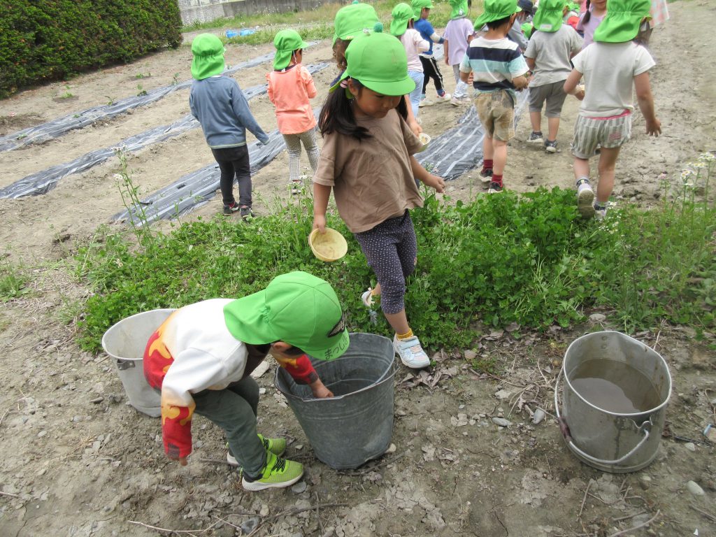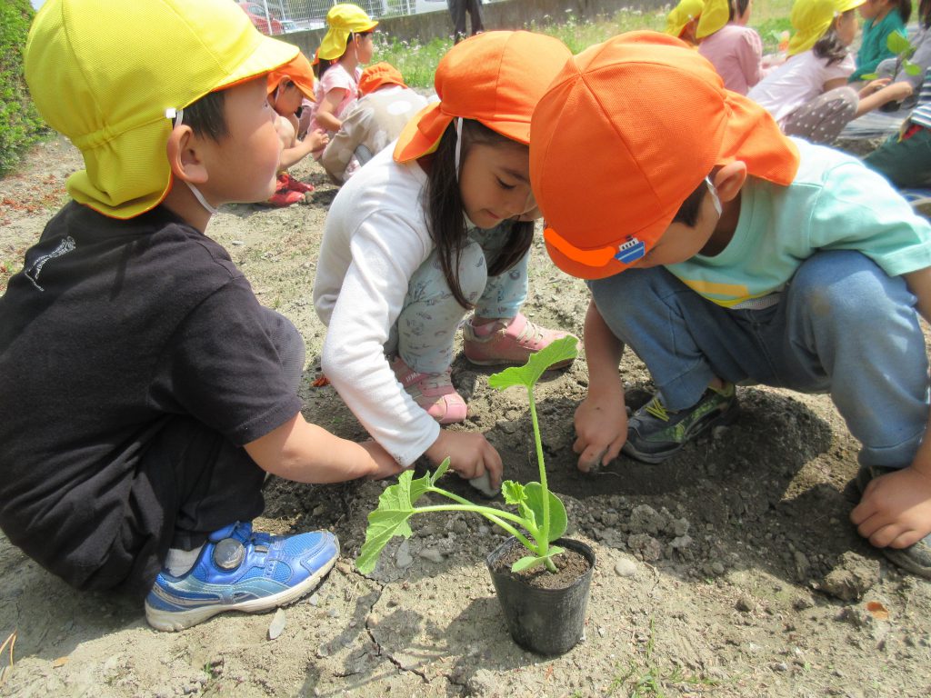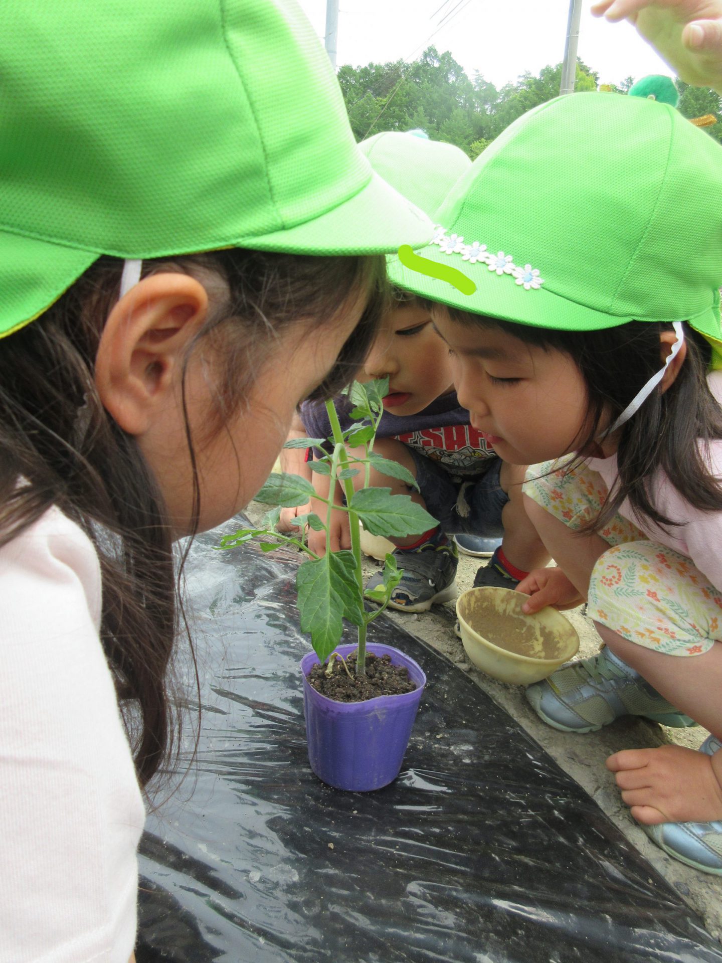 5月になり、チャイルドファームの取り組みで野菜の苗をたくさんいただき、園の畑に植えました。「とまとのにおいする~」