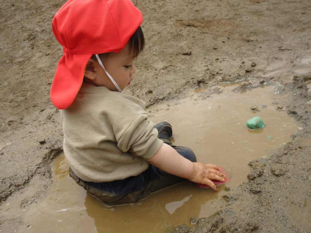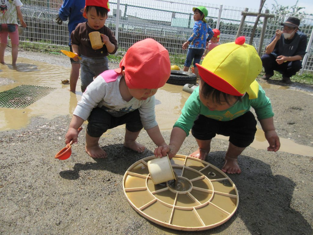 水たまりで汲んだ水を丸いお皿に入れます「ここにするか」といいながら。二人で一つのコップを使っています。「いっしょ」って、楽しいね