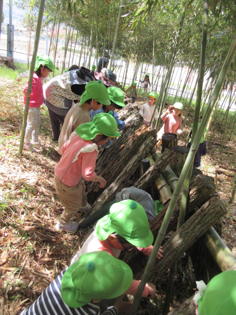 老松場(ろうしょうば)の方に声をかけていただき、椎茸を収穫。初めて体験する子も多く、初めは戸惑っていたけれど、慣れてくるとどんどん採れました。早速給食のメニューにはいり、春の味をいただきました