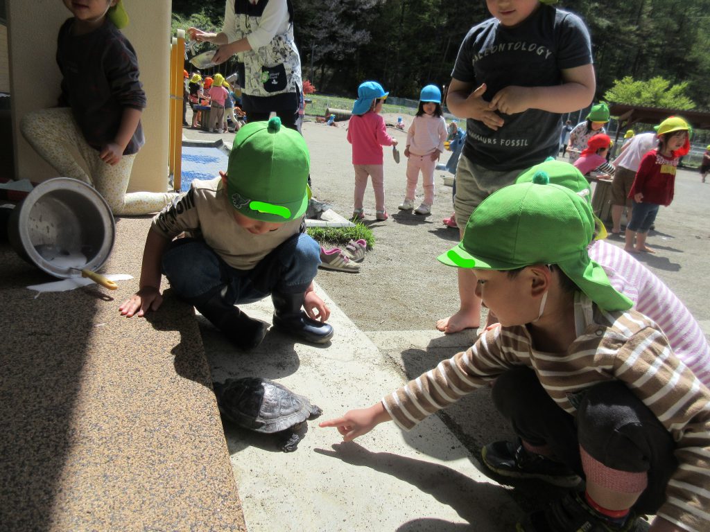 ケーキ屋さんのそばでは「かめ子」に、捕まえたミミズをあげています。「ミミズおいしい?」